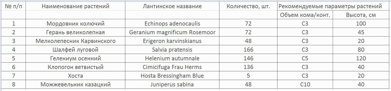Идея сада постоянного цветения воплощается следующим образом. В начале лета зеленый валун представляет собой растительную форму, собранную из текстур зеленых листьев и хвои (хоста, клопогон, можжевельник), а также белых, голубых, синих и розовых цветов (мордовник, герань, мелколепестник). В разгаре лета и сам валун начинает расцветать яркими красками и цветами. Гелениум на покрытии создает красные и желтые акценты, шалфей уравновешивает его своим сине-фиолетовым цветением, зацветает клопогон разных сортов.
