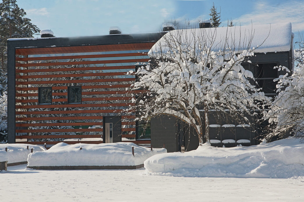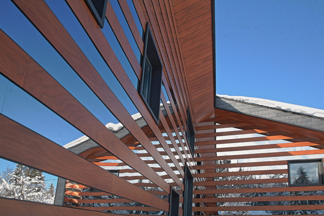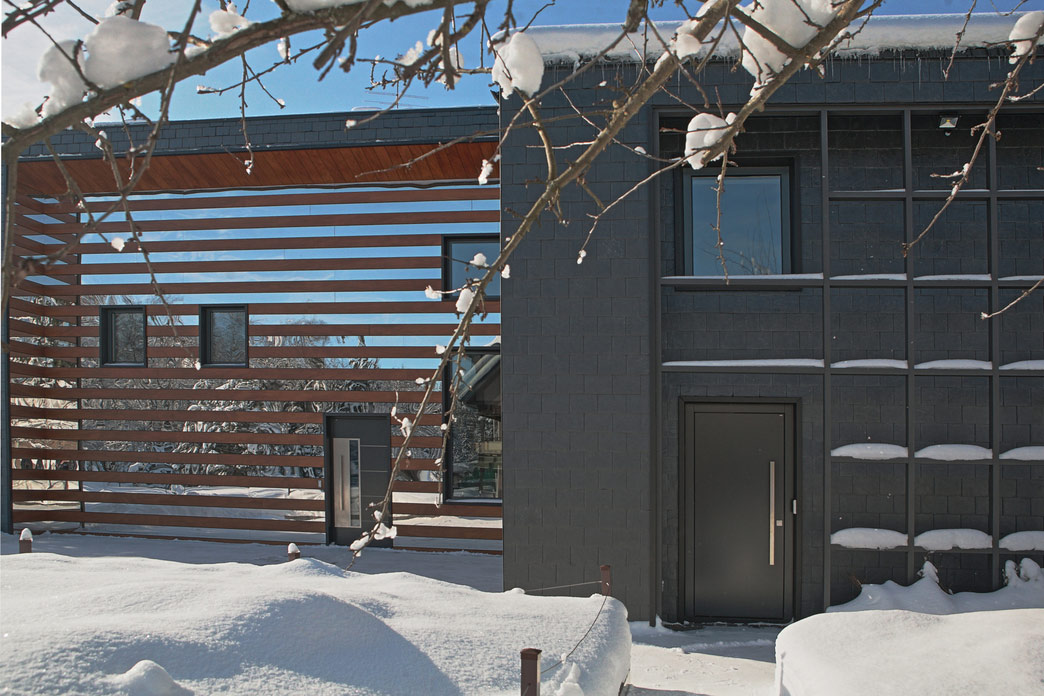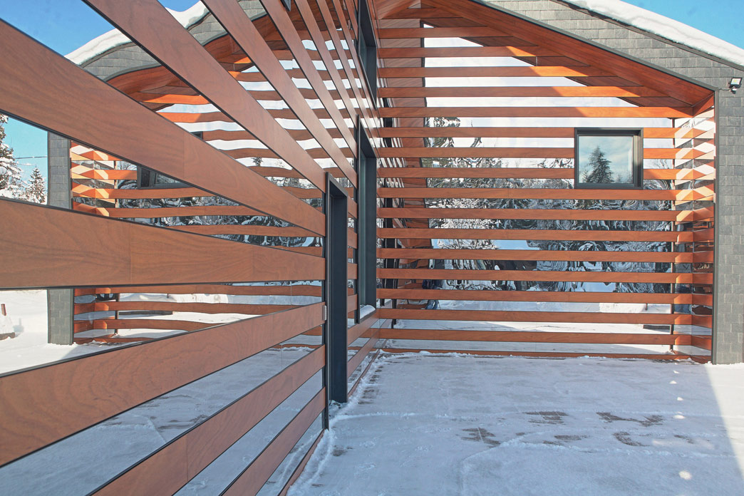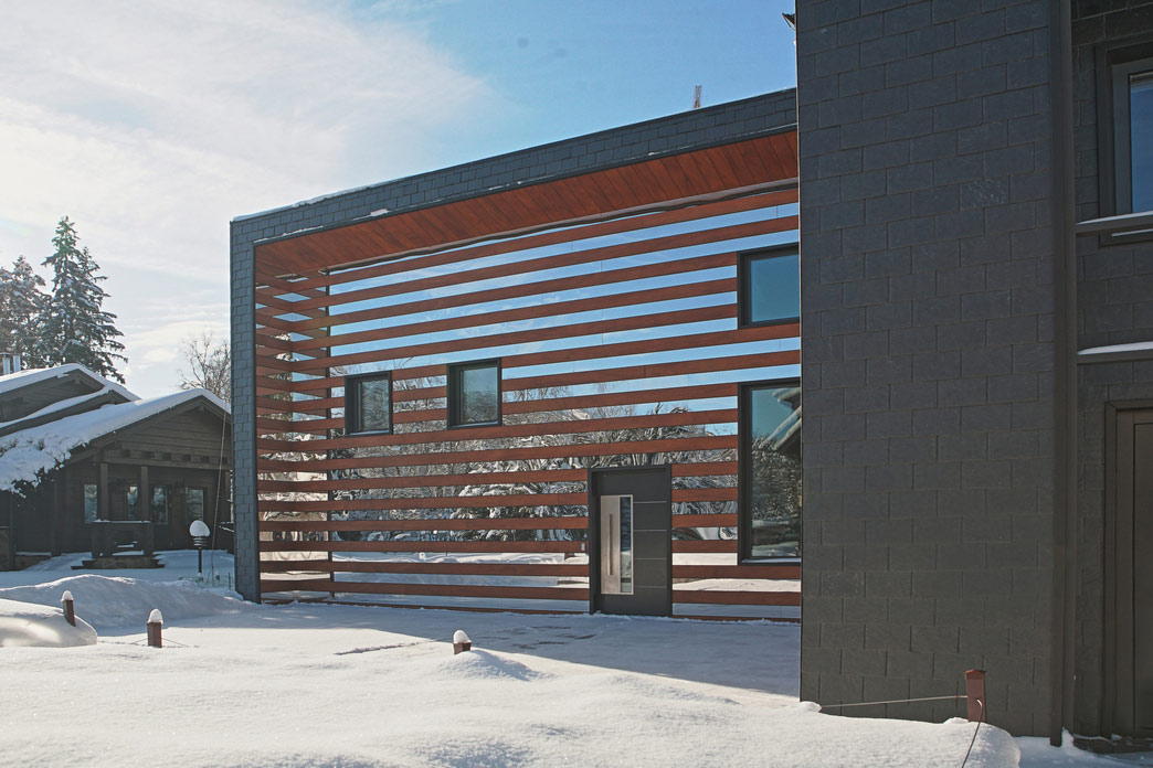 Внешняя отделка стен — декоративные панели Nichiha с текстурой кирпича и дерева.