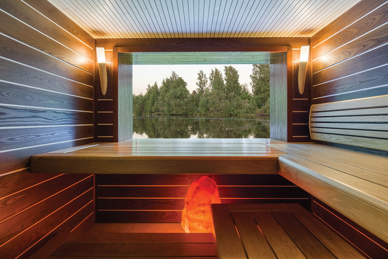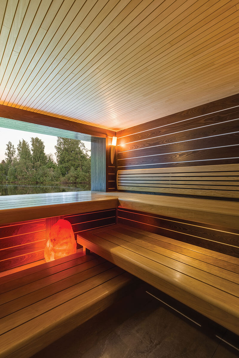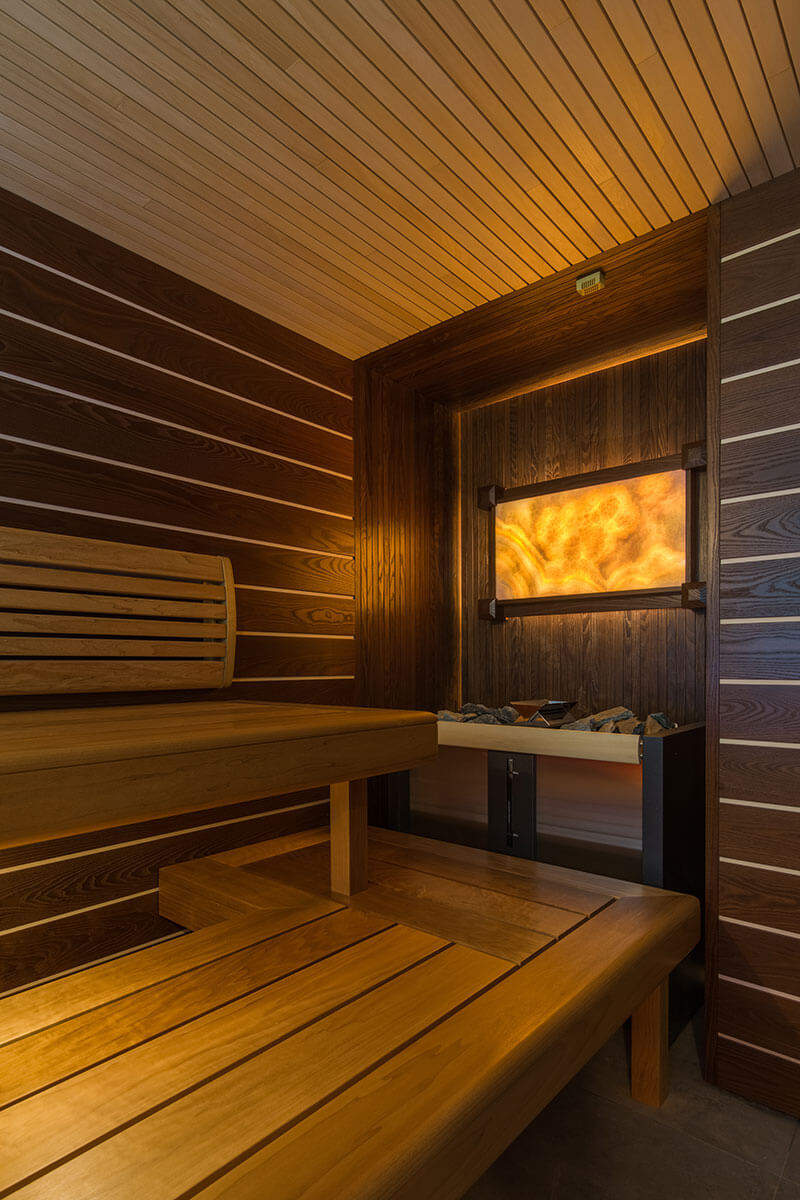 Материалы: стены обшиты панелями из термоясеня со швами из липы, для потолка выбрана липа, полки из термоосины.