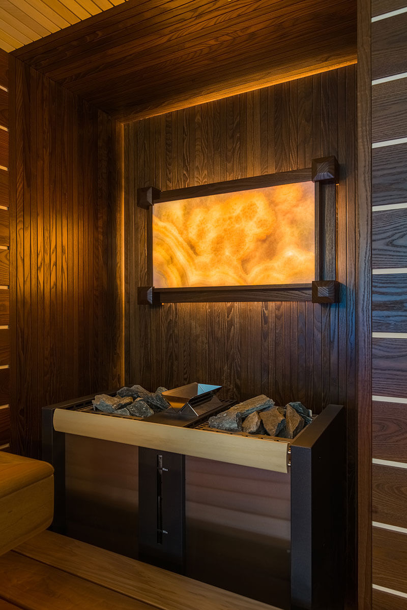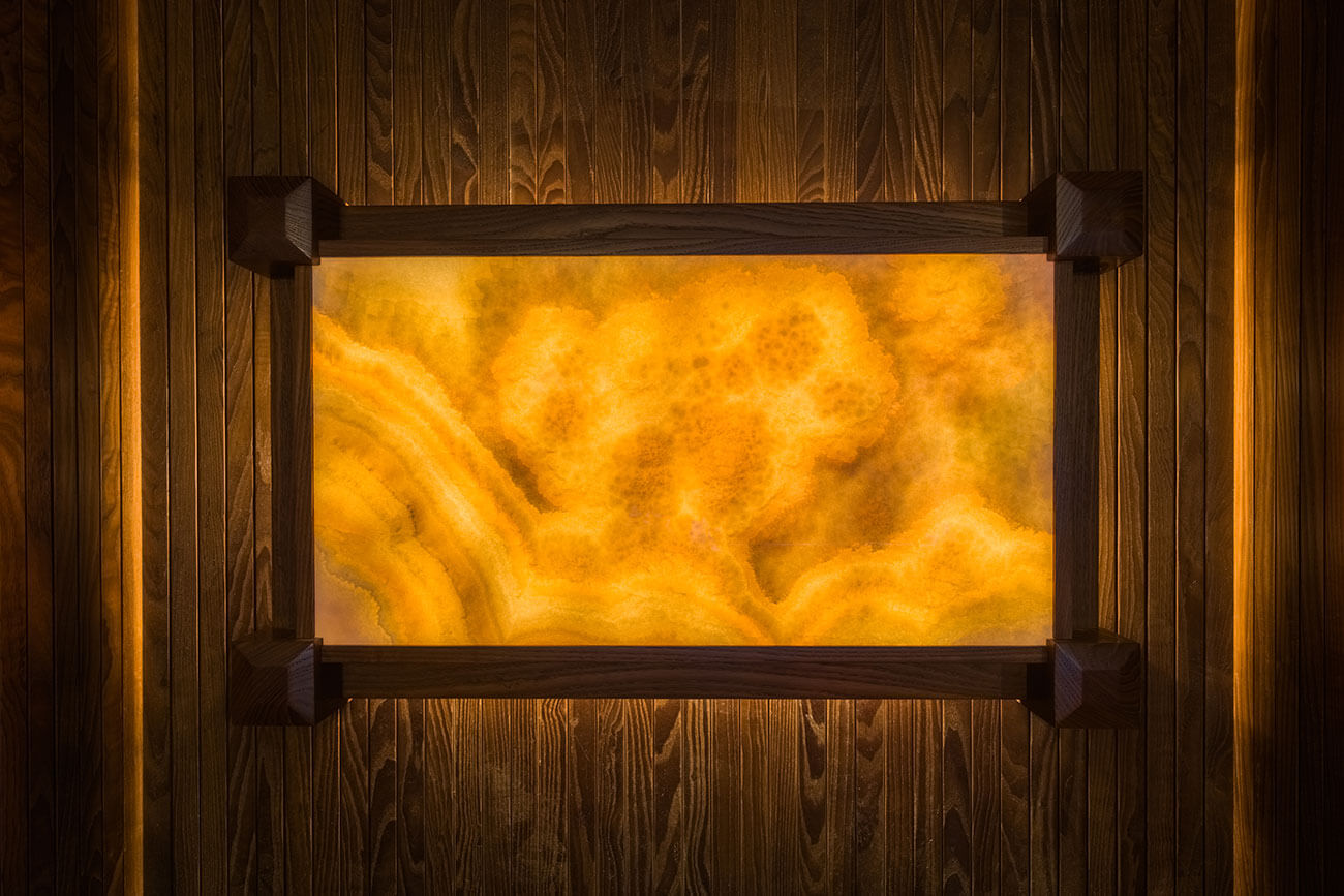 Над печью — редкий оникс желтого оттенка, обрамленный деревом, с подсветкой.