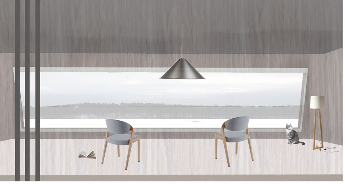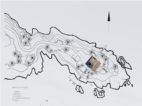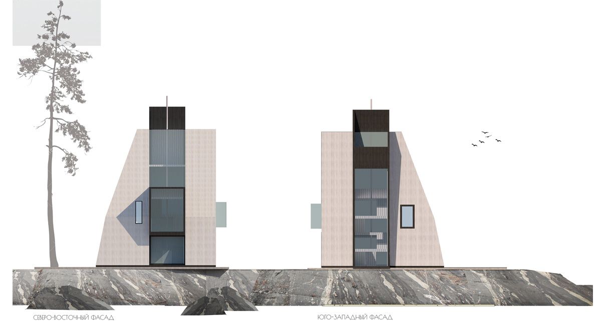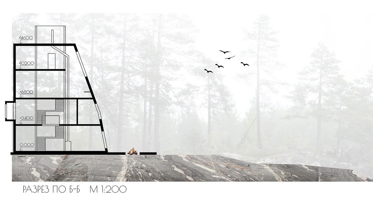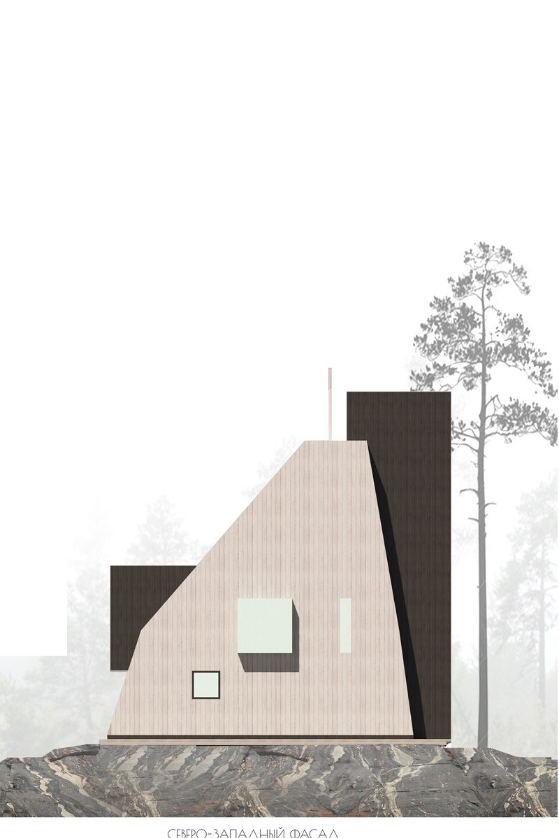 Частный двухэтажный дом для архитектора и его семьи, запроектированный для круглогодичного использования, расположен на скалистом мысу на Ладожском озере. Для творческой натуры необходимо место для уединения, и такое место, окруженное густым лесом, как раз подходит для тихой работы.