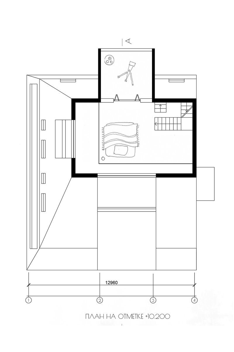 Первый этаж — это объединенное пространство кухни, столовой и гостиной, в центре которого расположена большая дровяная печь. Место для хранения вынесено в гардеробную комнату, чтобы освободить комнаты от лишней мебели. На втором этаже — спальная зона и рабочий кабинет. Третий этаж полностью отдан под мастерскую архитектура. Имеется также четвертый полуэтаж с кроватью и небольшим балконом, на котором стоит телескоп.