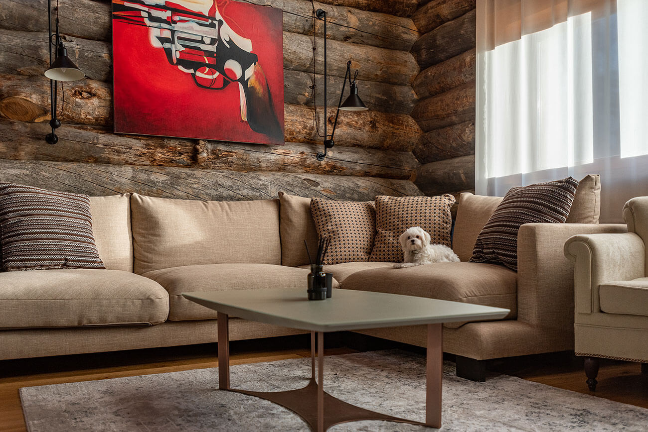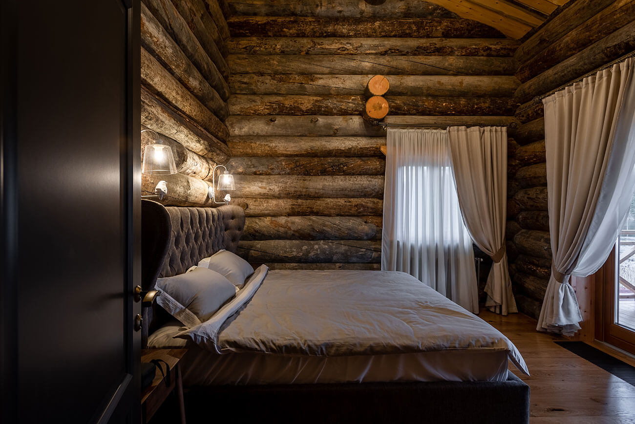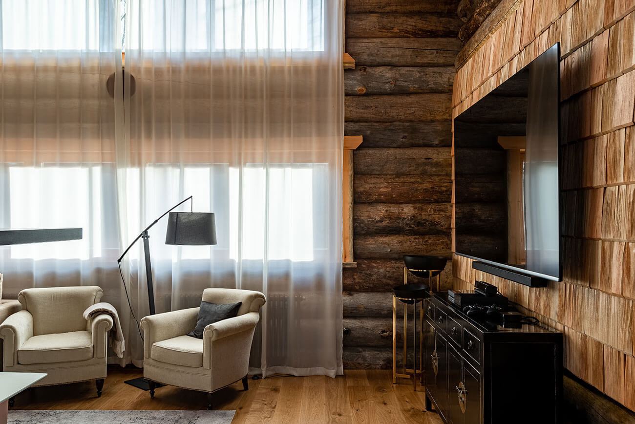 Архитектурное решение образа дома — объемно-пространственная композиция горизонтальной направленности, симметричная в своей основе и подчеркнутая линиями кровель, архитектурными элементами и деталями, сочетающая современное видение с традициями деревянной архитектуры. Широкие, относительно пологие кровли объединяют и зрительно и фактически занижают объем, усиливая его связь с ландшафтом.