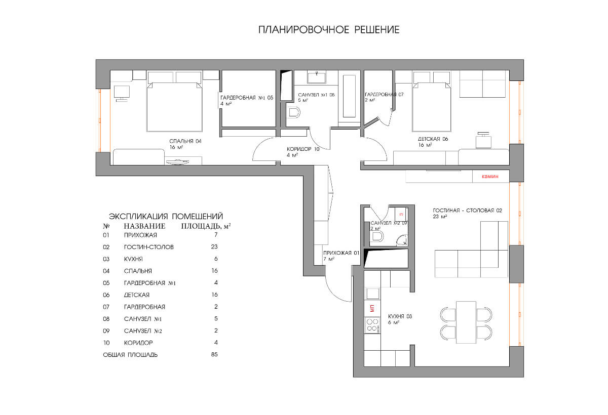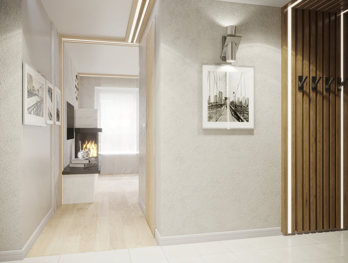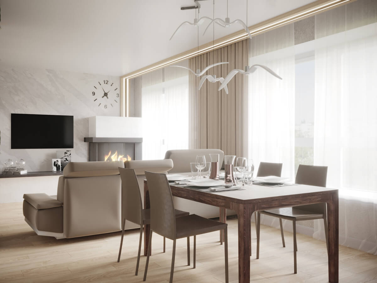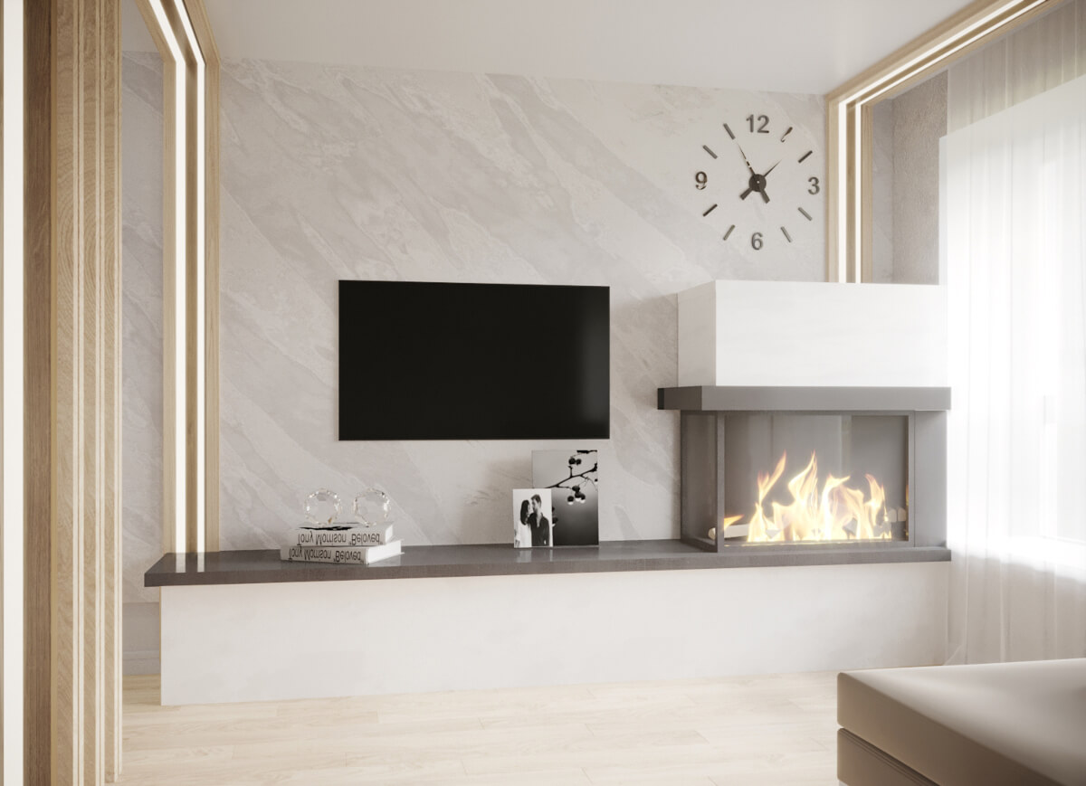 Яркой деталью является биокамин в стиле хай-тек с живым пламенем.