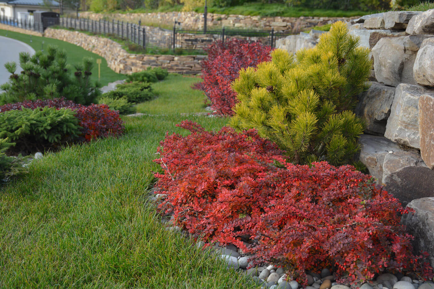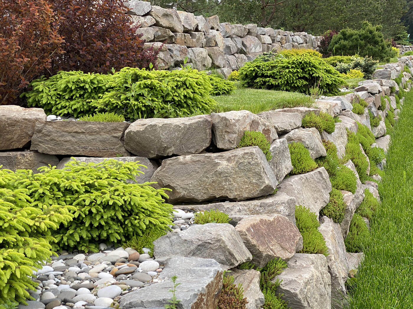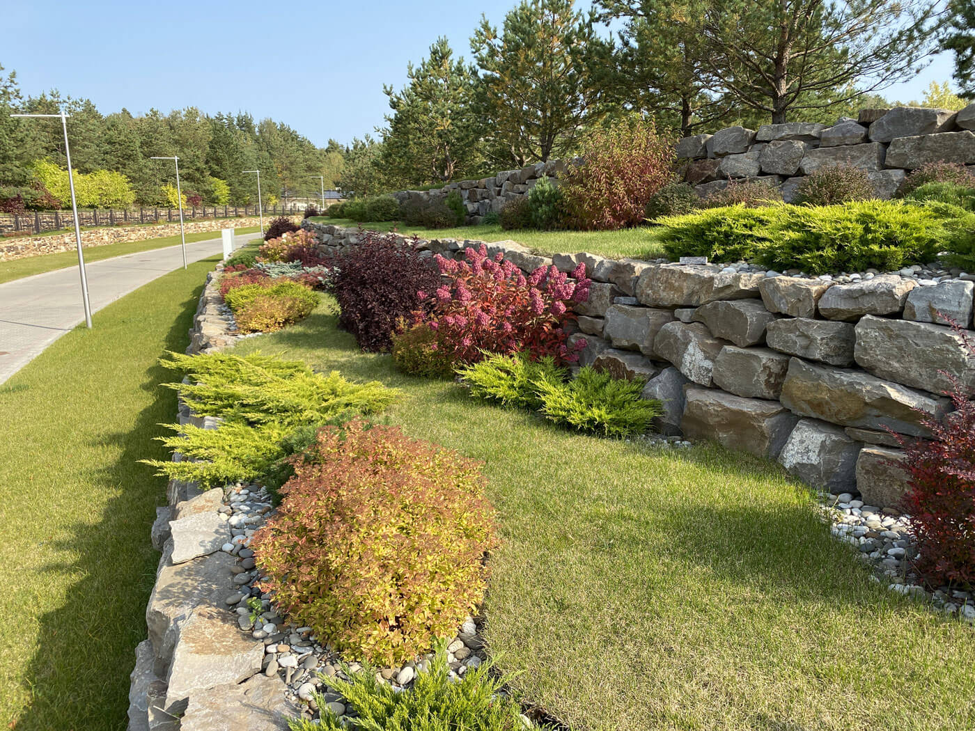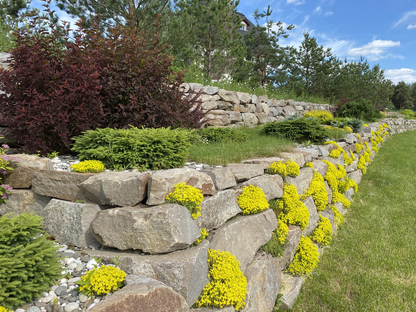 Подпорные стенки протяженностью 200 метров по периметру участка оформлены плавными групповыми посадками. Были подобраны низкие хвойные и лиственные кустарники и высажены массивом в контрастном сочетании. Стенка имеет 2 уровня. Подпорные стенки выполняют функцию удержания грунта и террасированием создают ограждение участка при помощи геопластики. Стенки сложены методом сухой кладки (камень кварцит), между грунтом и камнем проложен геотекстиль. В расщелины между камнями засыпан грунт вручную и посажены почвопокровные многолетники.
