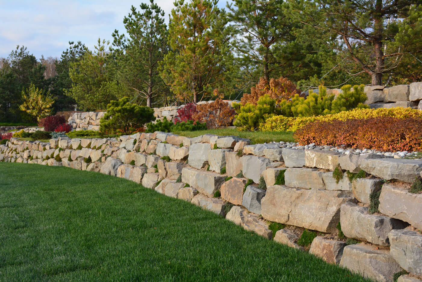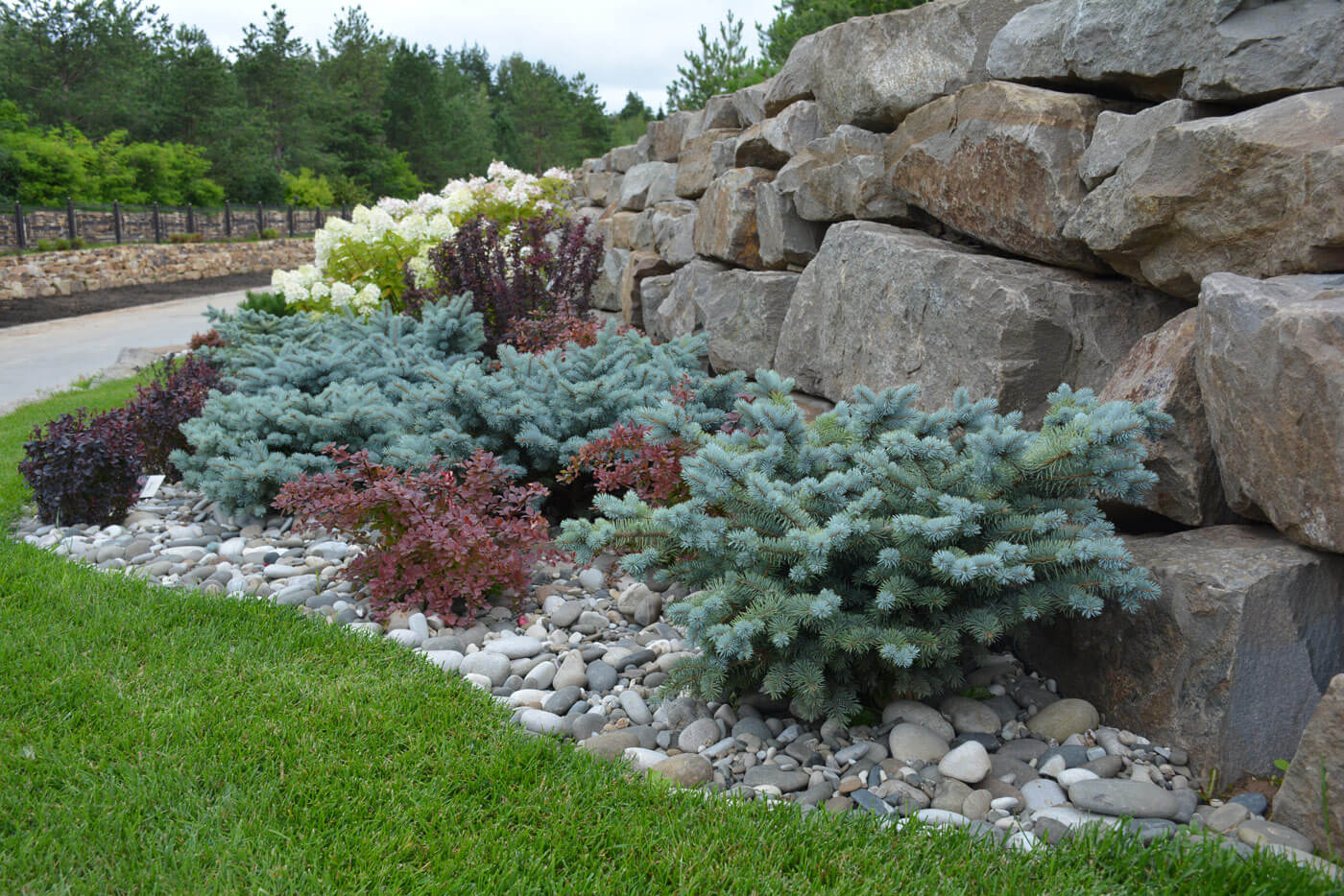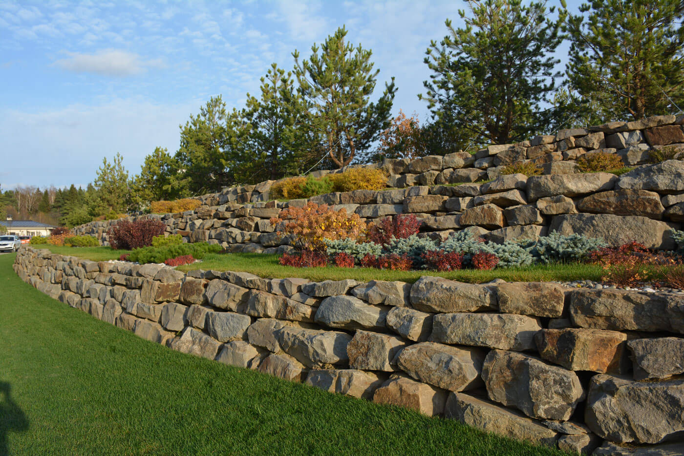 Подпорные стенки протяженностью 200 метров по периметру участка оформлены плавными групповыми посадками. Были подобраны низкие хвойные и лиственные кустарники и высажены массивом в контрастном сочетании. Стенка имеет 2 уровня. Подпорные стенки выполняют функцию удержания грунта и террасированием создают ограждение участка при помощи геопластики. Стенки сложены методом сухой кладки (камень кварцит), между грунтом и камнем проложен геотекстиль. В расщелины между камнями засыпан грунт вручную и посажены почвопокровные многолетники.