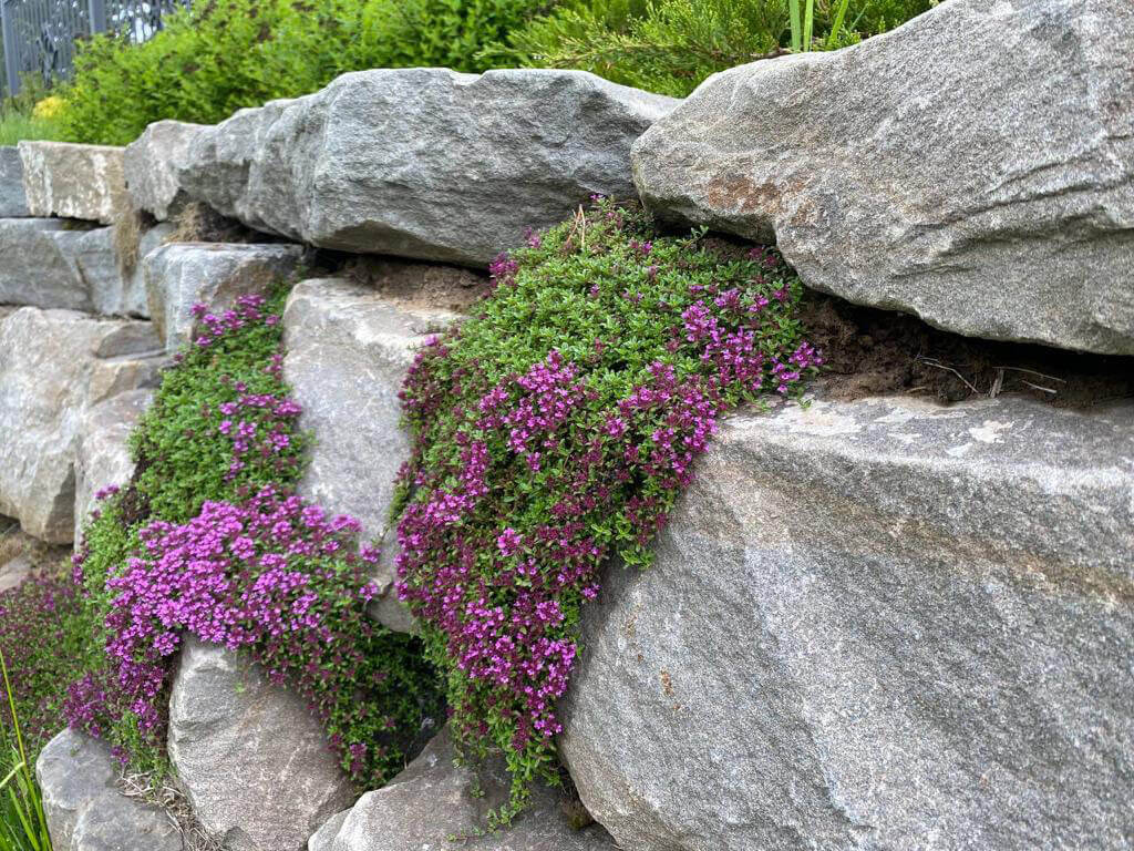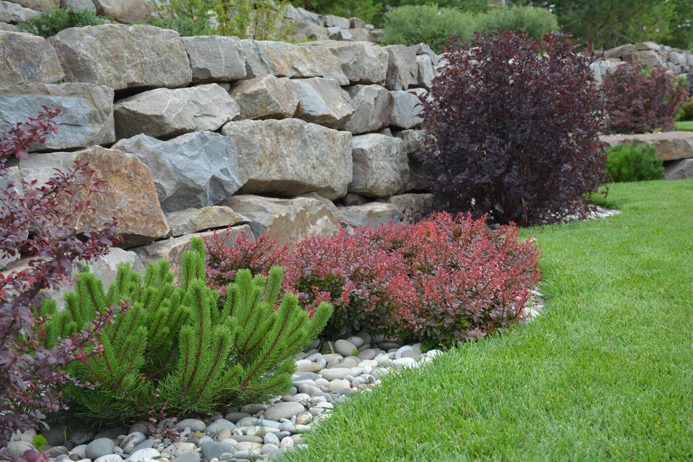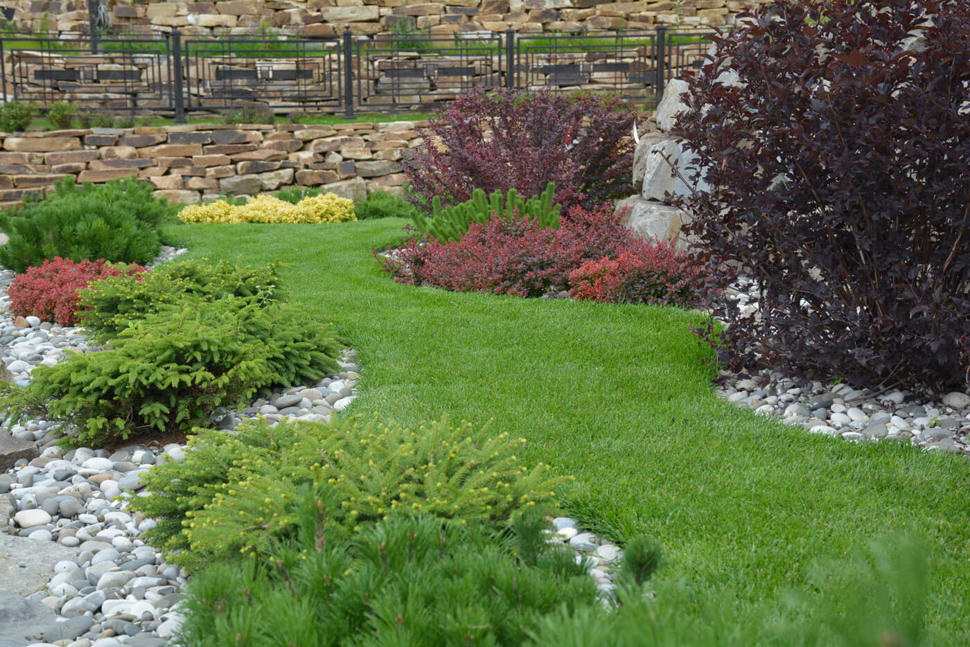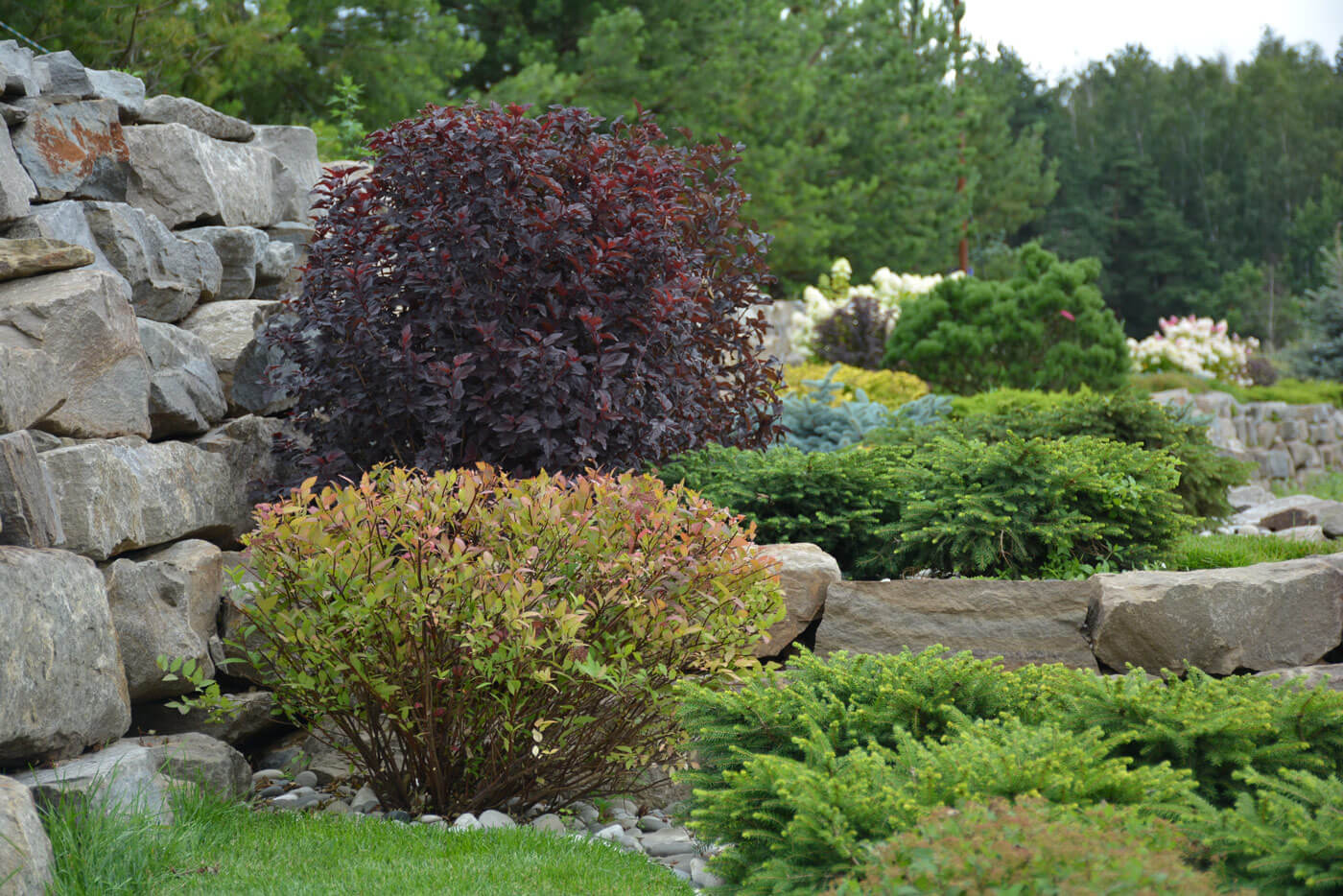 Подпорные стенки протяженностью 200 метров по периметру участка оформлены плавными групповыми посадками. Были подобраны низкие хвойные и лиственные кустарники и высажены массивом в контрастном сочетании. Стенка имеет 2 уровня. Подпорные стенки выполняют функцию удержания грунта и террасированием создают ограждение участка при помощи геопластики. Стенки сложены методом сухой кладки (камень кварцит), между грунтом и камнем проложен геотекстиль. В расщелины между камнями засыпан грунт вручную и посажены почвопокровные многолетники.