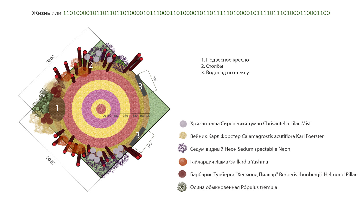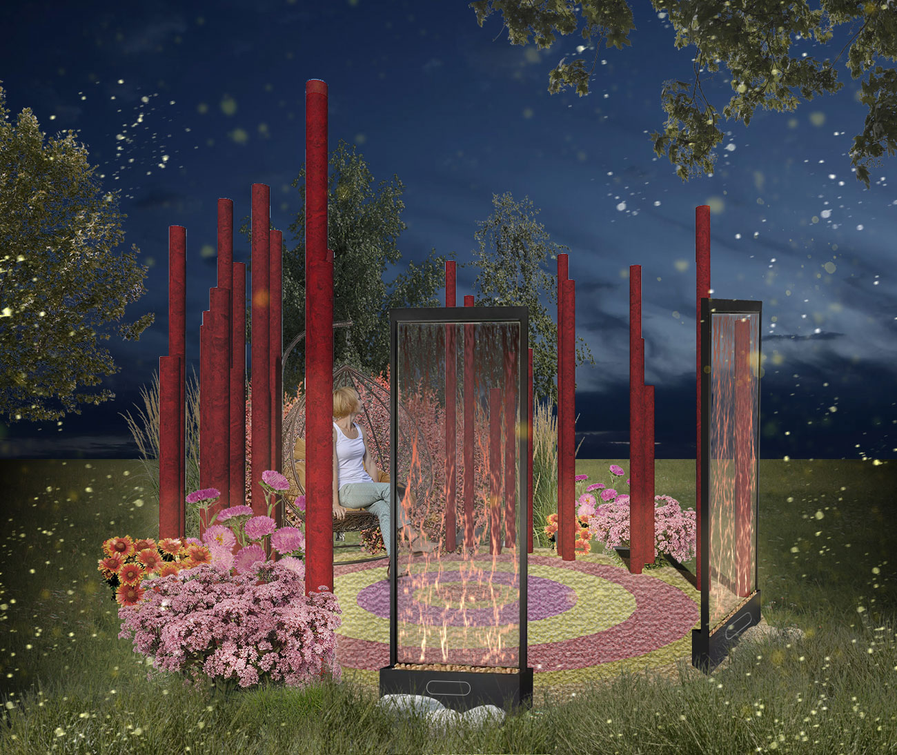 Мы научились знакомиться в интернете, узнали, что работать и учиться можно удалённо, посадили виртуальные сады и посетили сотни музеев и концертов, не выходя из дома. Мы создали идеальный мир, который состоит из набора нулей и единиц, заменив им мир, созданный Богом. Люди предпочитают забывать о том, для чего приходят на Землю: найти смысл своего существования и отыскать своё истинное предназначение, — ведь для этого необходимо бросить вызов миру реальному, приложить максимум усилий, преодолеть свои страхи и осмыслить каждый сделанный шаг. Этот сад – своего рода макет виртуального мира, где каждому из нас уготовано тёплое место. На первый взгляд в нём всё по-настоящему, но так ли это на самом деле? Приглядитесь: мандала кажется совершенной, но это лишь иллюзия гармонии и счастья. Вода на экранах смартфонов — символ жизни... Или это время, которое незаметно утекает, забирая драгоценные годы? Красные столбы – стена, которой мы оградились от мира, но от чего на самом деле она защищает?
