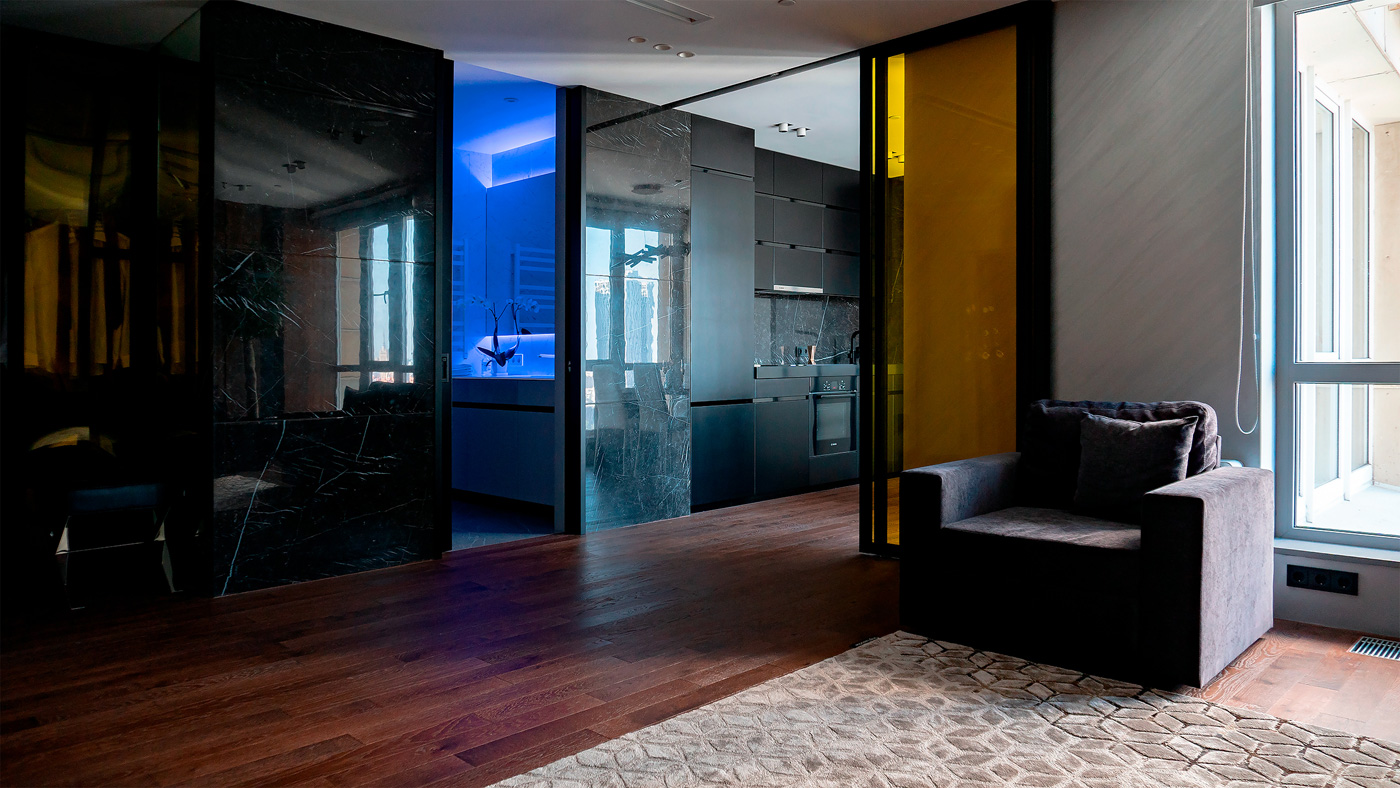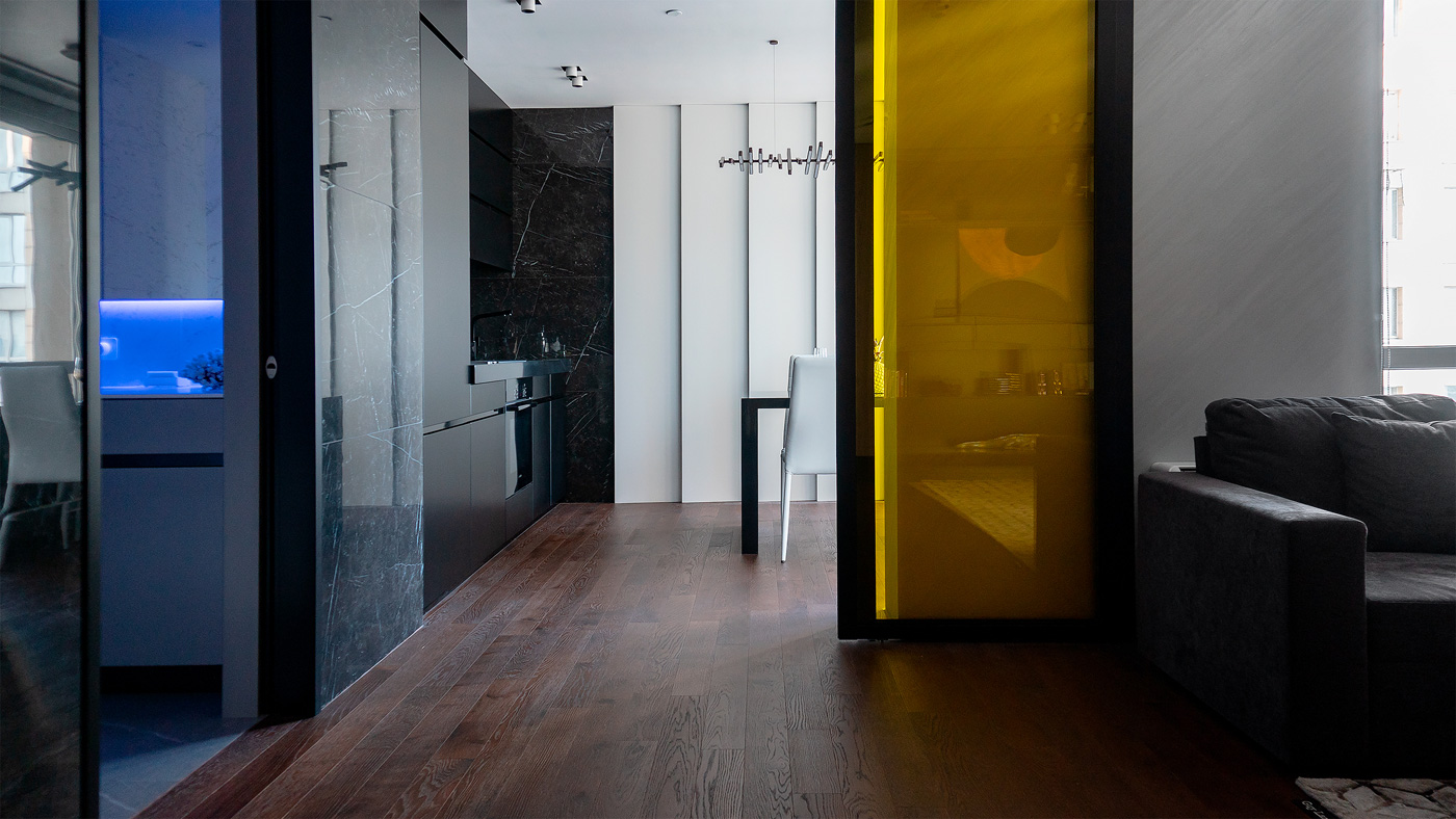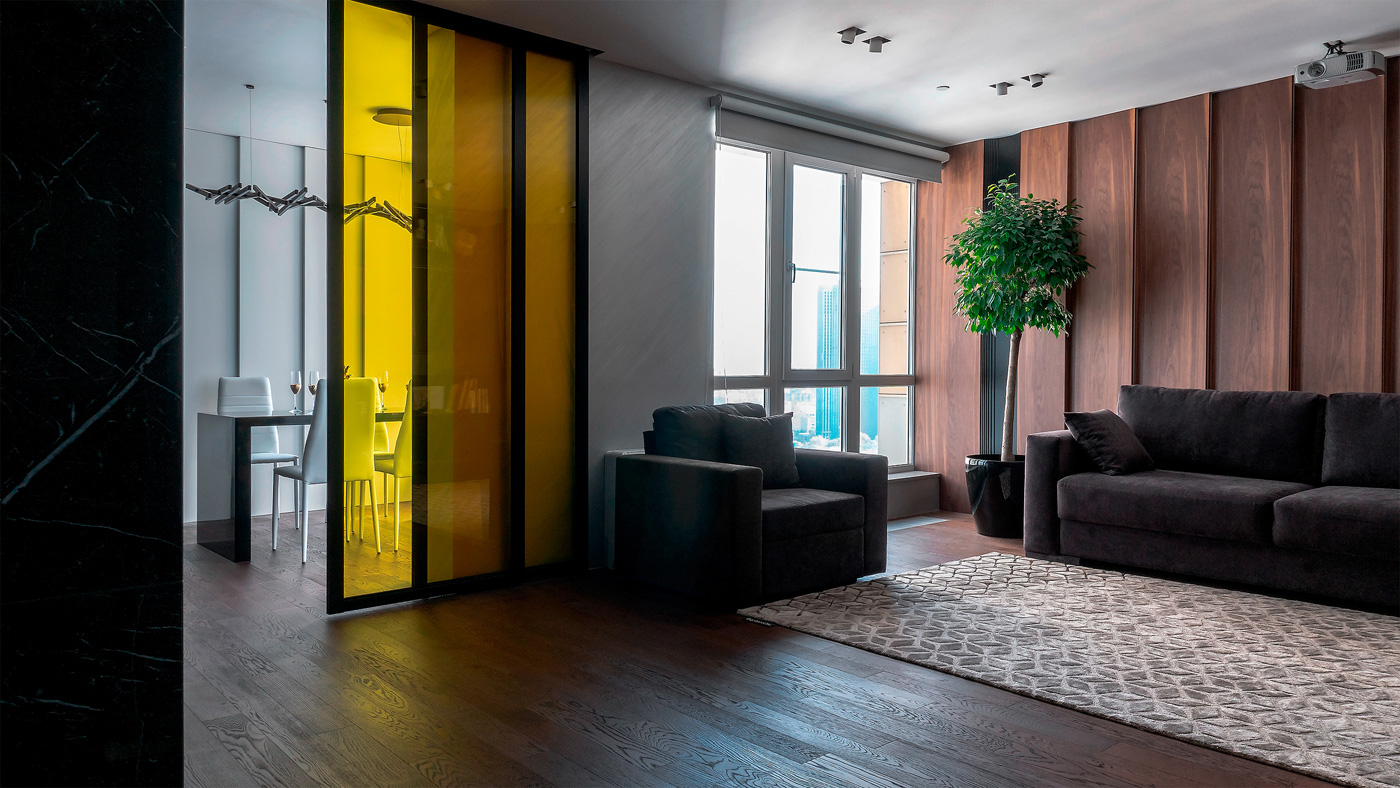 Раздвижные двери неслучайно использованы в интерьере. Они помогают экономить пространство, а при необходимости с легкостью объединяют всю квартиру в одно помещение.