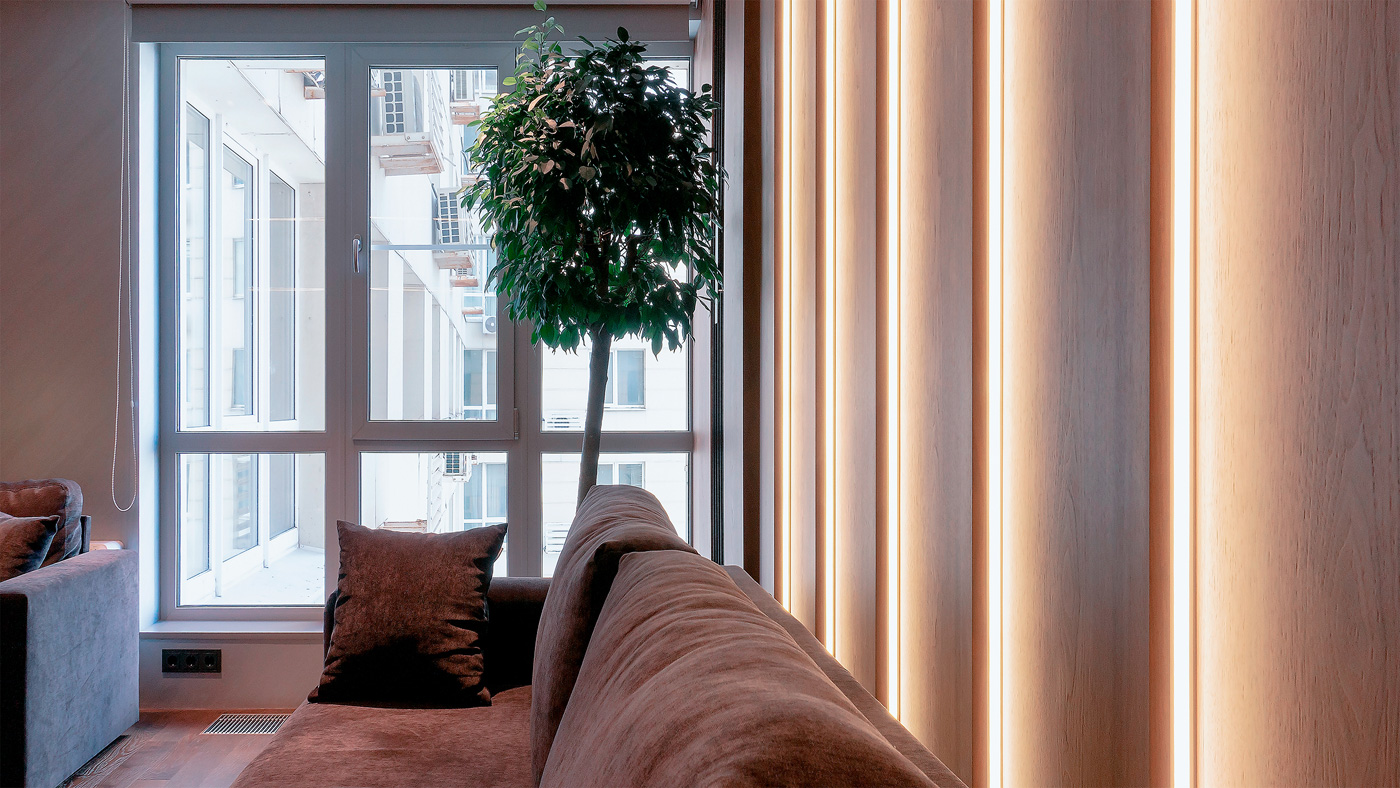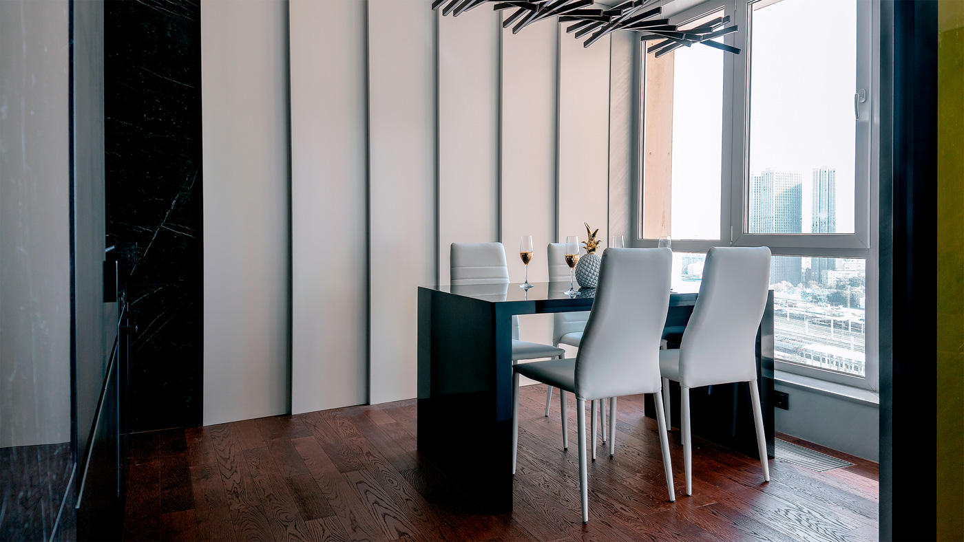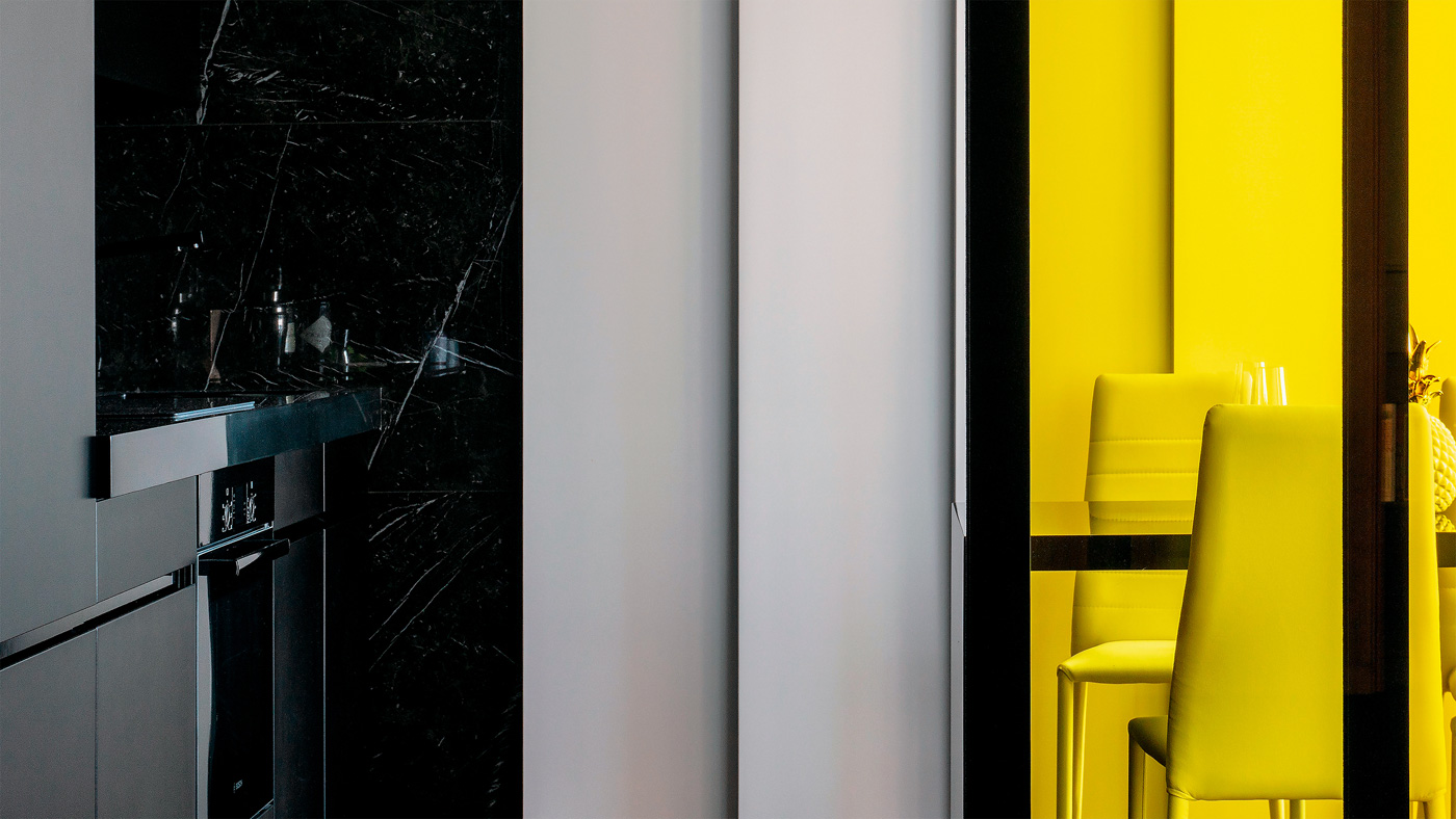 Раздвижные двери неслучайно использованы в интерьере. Они помогают экономить пространство, а при необходимости с легкостью объединяют всю квартиру в одно помещение.