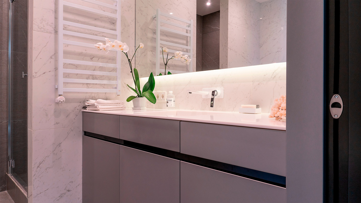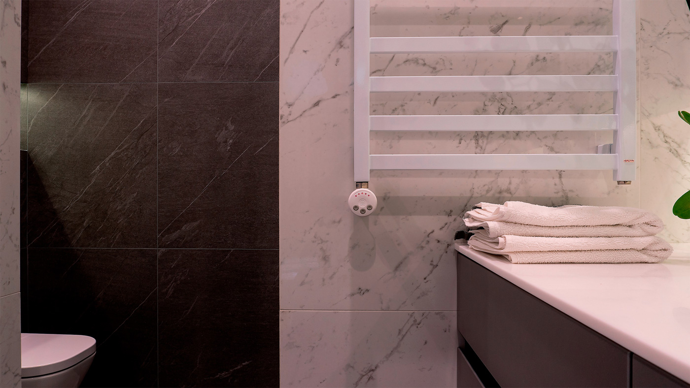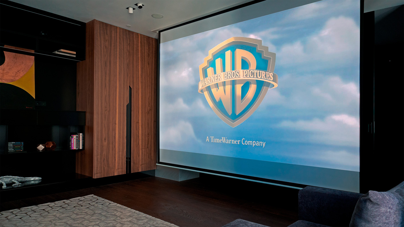 Скрытый в потолок выдвигающийся проекторный фон становится дополнительной изюминкой помещения, образуя стенку и формируя коридор между туалетом и прихожей.