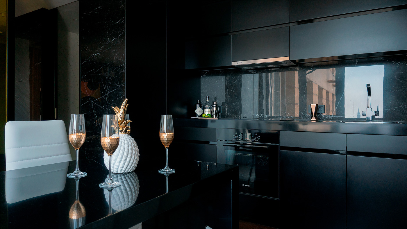 Кухня получилась отдельным помещением, которое также выполняет функцию рабочего кабинета. В его оснащение входят дополнительне осветительные приборы и скрытые розетки. Массивный стол весом 80 кг сделан из искусственного камня. Пожелание заказчика было, чтоб весь интерьер был максимально прочным. Дверь в туалет разработана по индивидуальному заказу. Она глубоко утапливается внутрь и не имеет визуальных просветов.