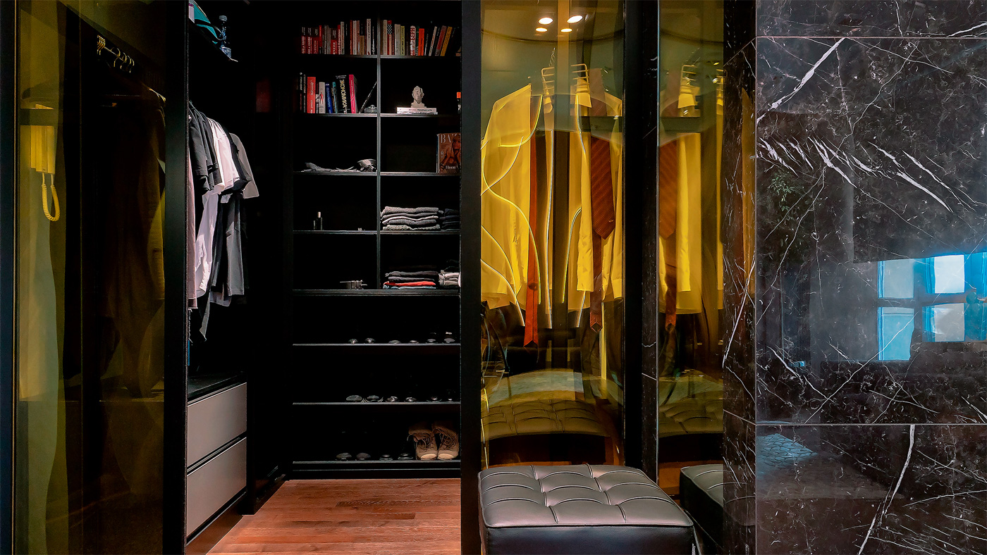 Диван в гостевой зоне при необходимости превращается в удобную кровать. Большой шкаф вмещает в себя не только пастельное белье, но и сезонный гардероб, серверный узел и дополнительное звуковое оборудование.