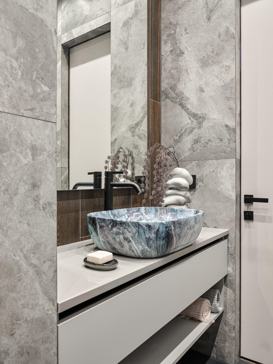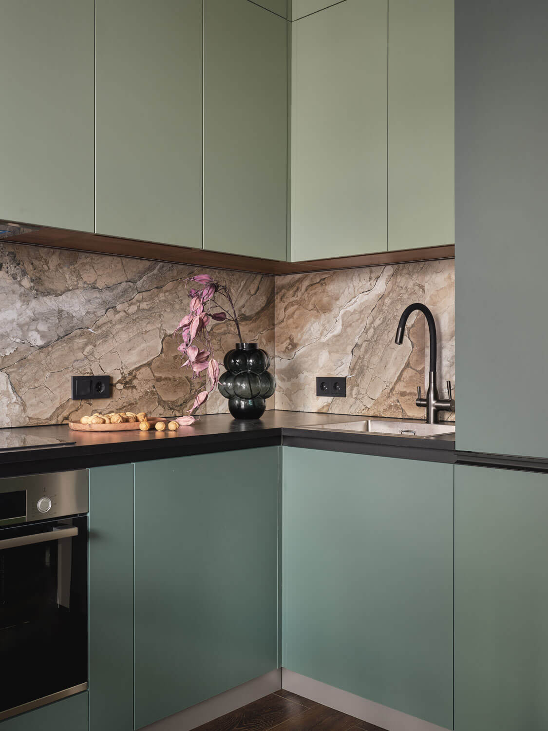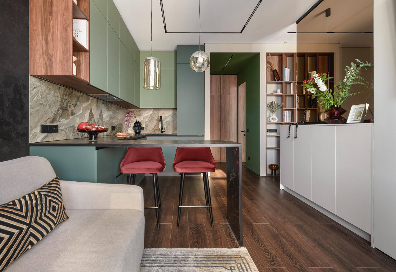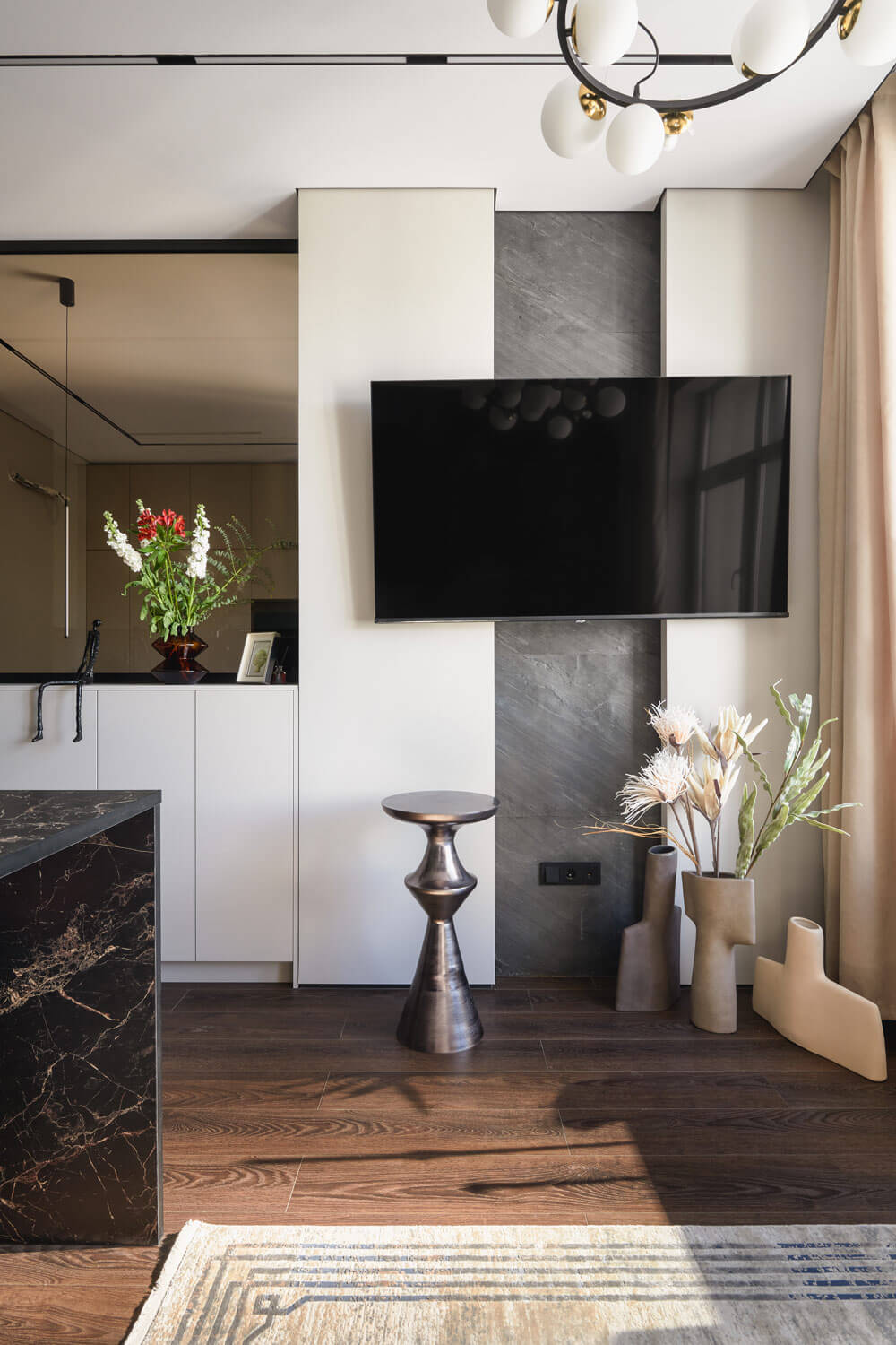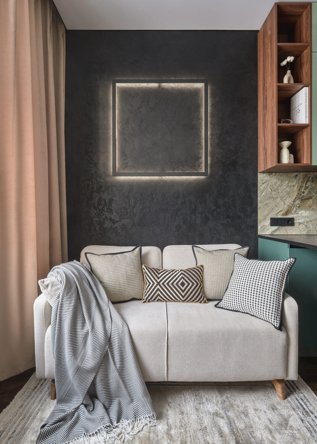 В зоне гостиной мы использовали шпон сланца и декоративную штукатурку. При создании цветовой палитры использовали яркие, но сложные и приглушенные оттенки, которые не раздражают глаз.