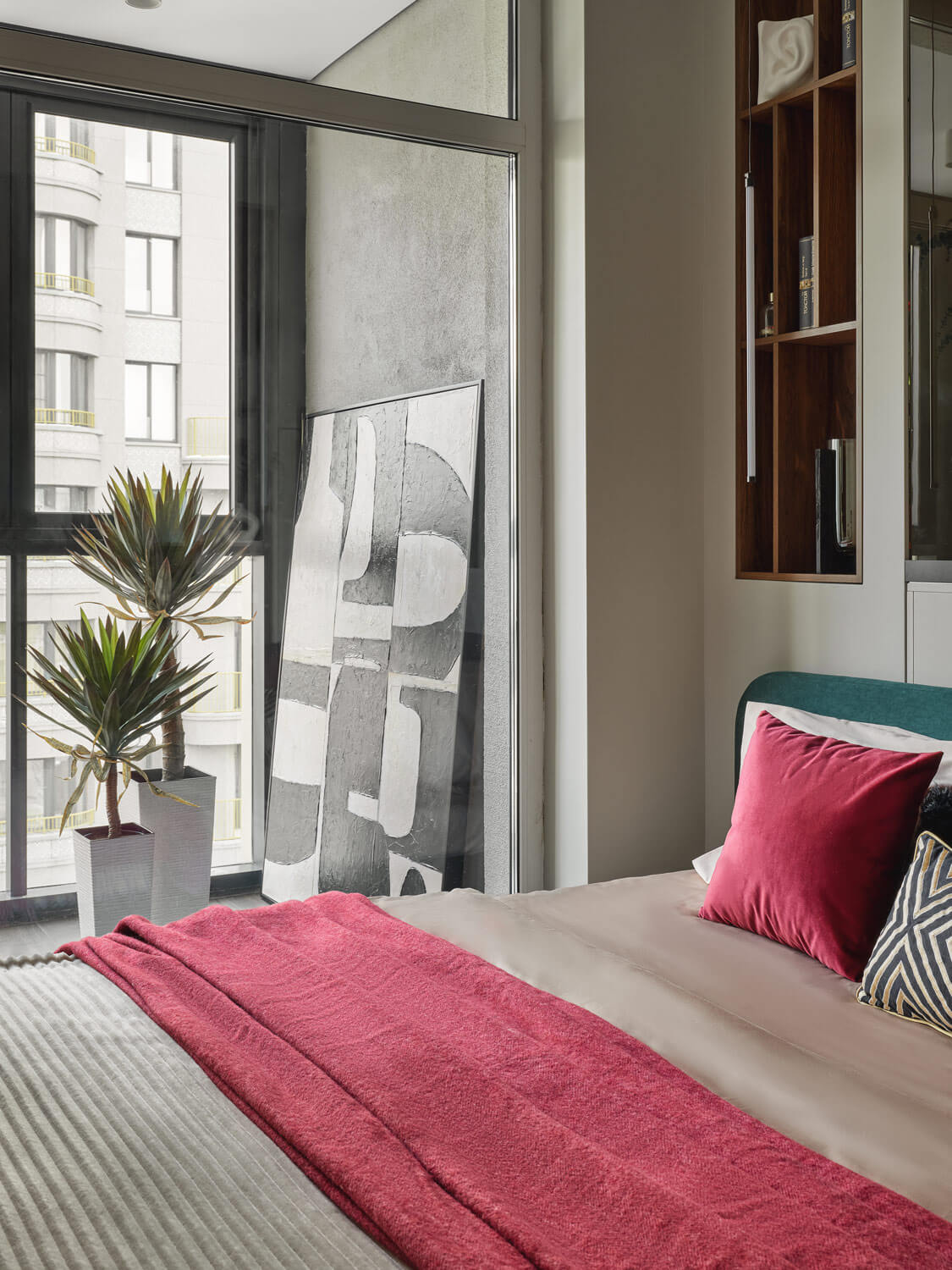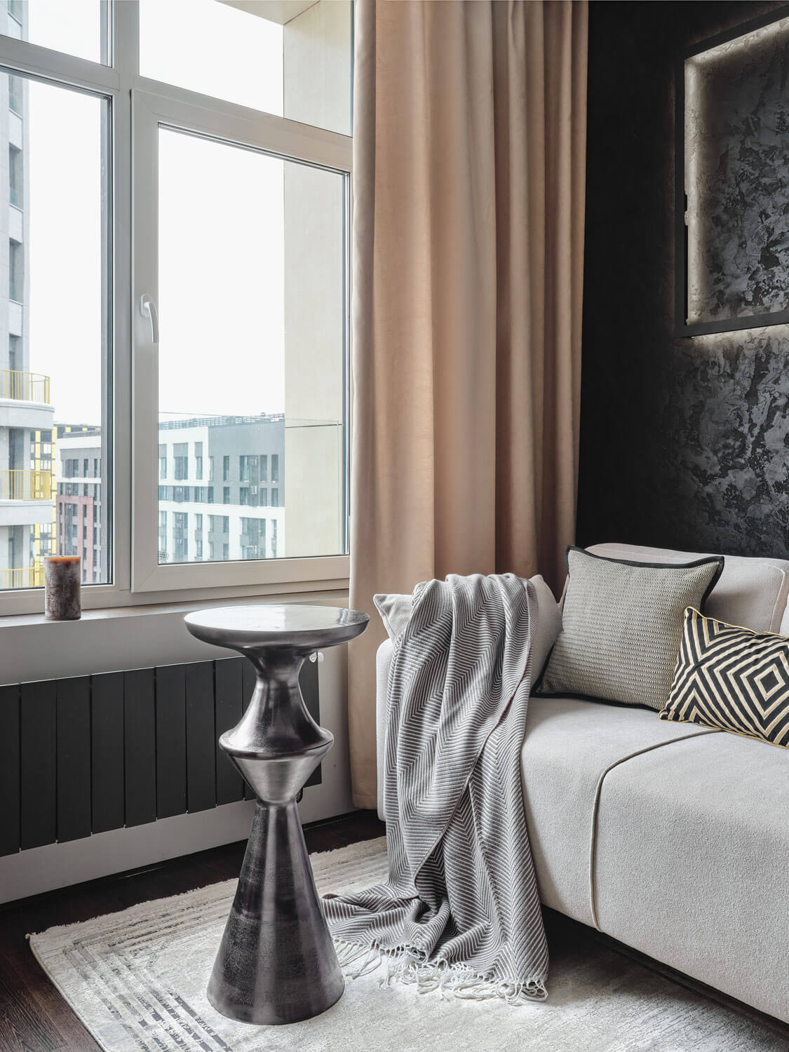 Ключевым при создании этого пространства стал вид из окна: диван, кровать и барная стойка ориентированы таким образом, чтобы, отдыхая на них, открывался вид на реку, а не на соседнее здание.