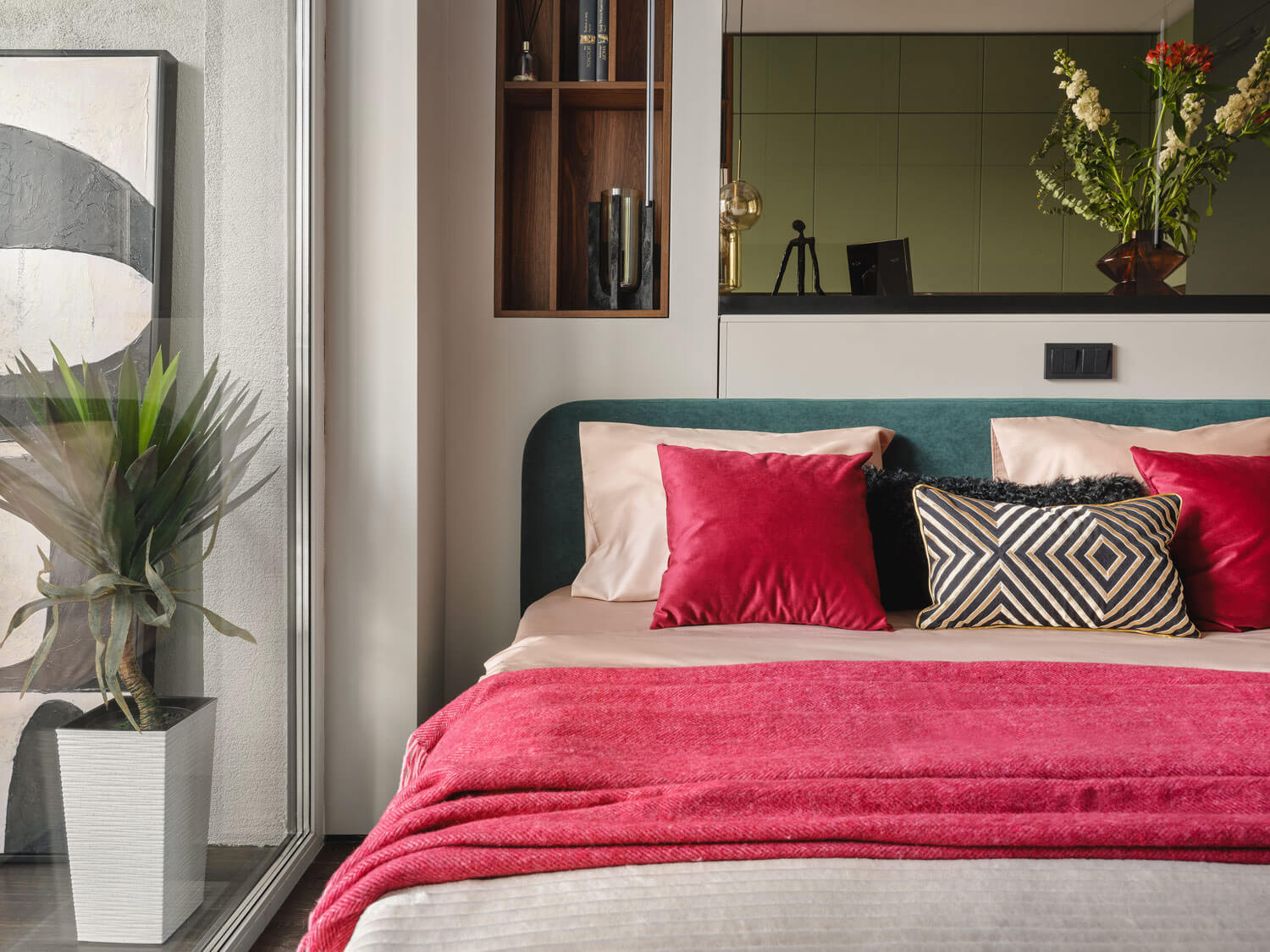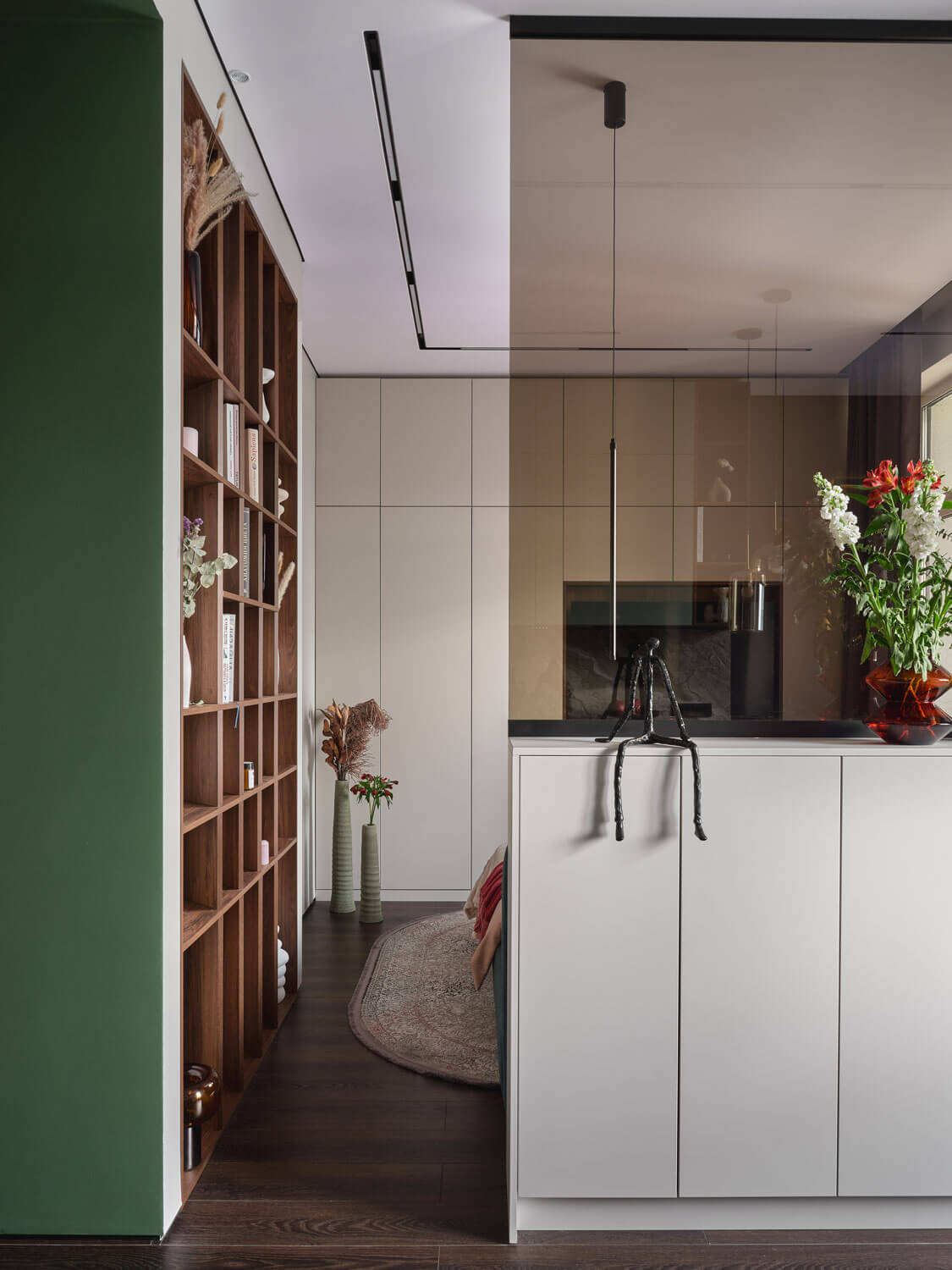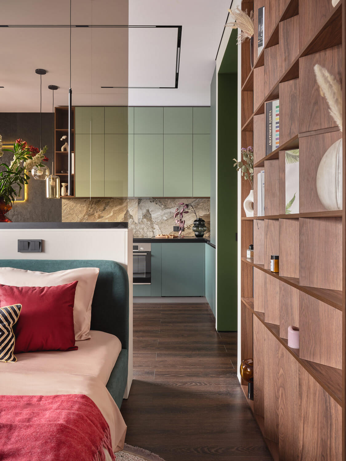 Чтобы сохранить максимум воздуха и света, кухню-гостиную и спальню мы разделили легкой мебельной конструкцией с ящиками со стороны кухни, поверх которой установили тонированное стекло. Вход в спальню оставили свободным, вдоль него разместили стеллаж для книг и декора.