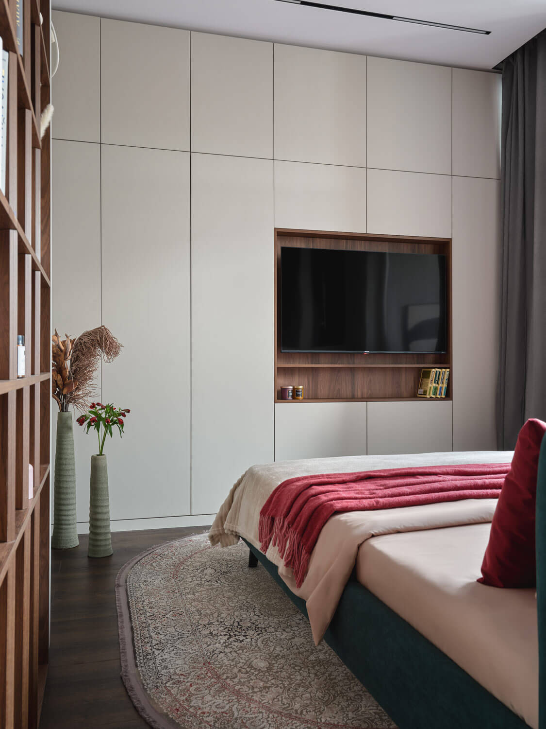 В спальне одна из стен представляет собой компактную зону хранения глубиной 40 см во всю ширину стены с фронтальными вешалками и полками. Сюда же встроена ниша для ТВ таким образом, чтобы экран был в одной плоскости с фасадами.
