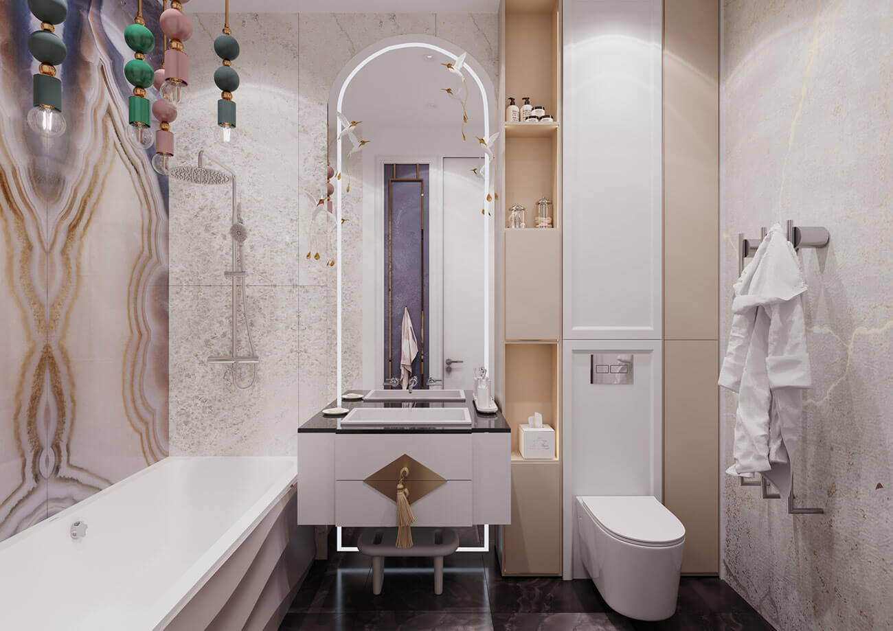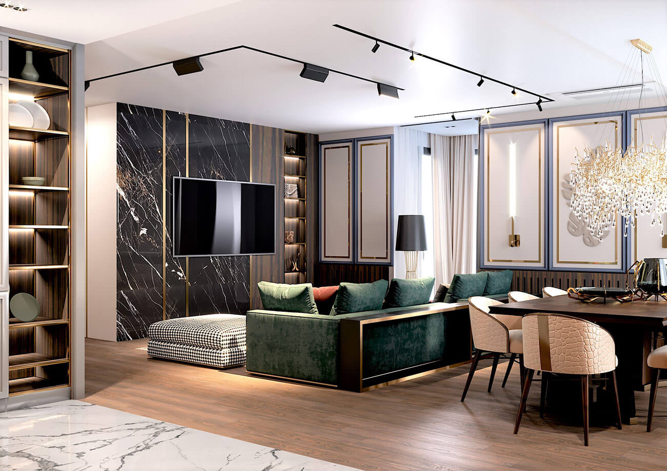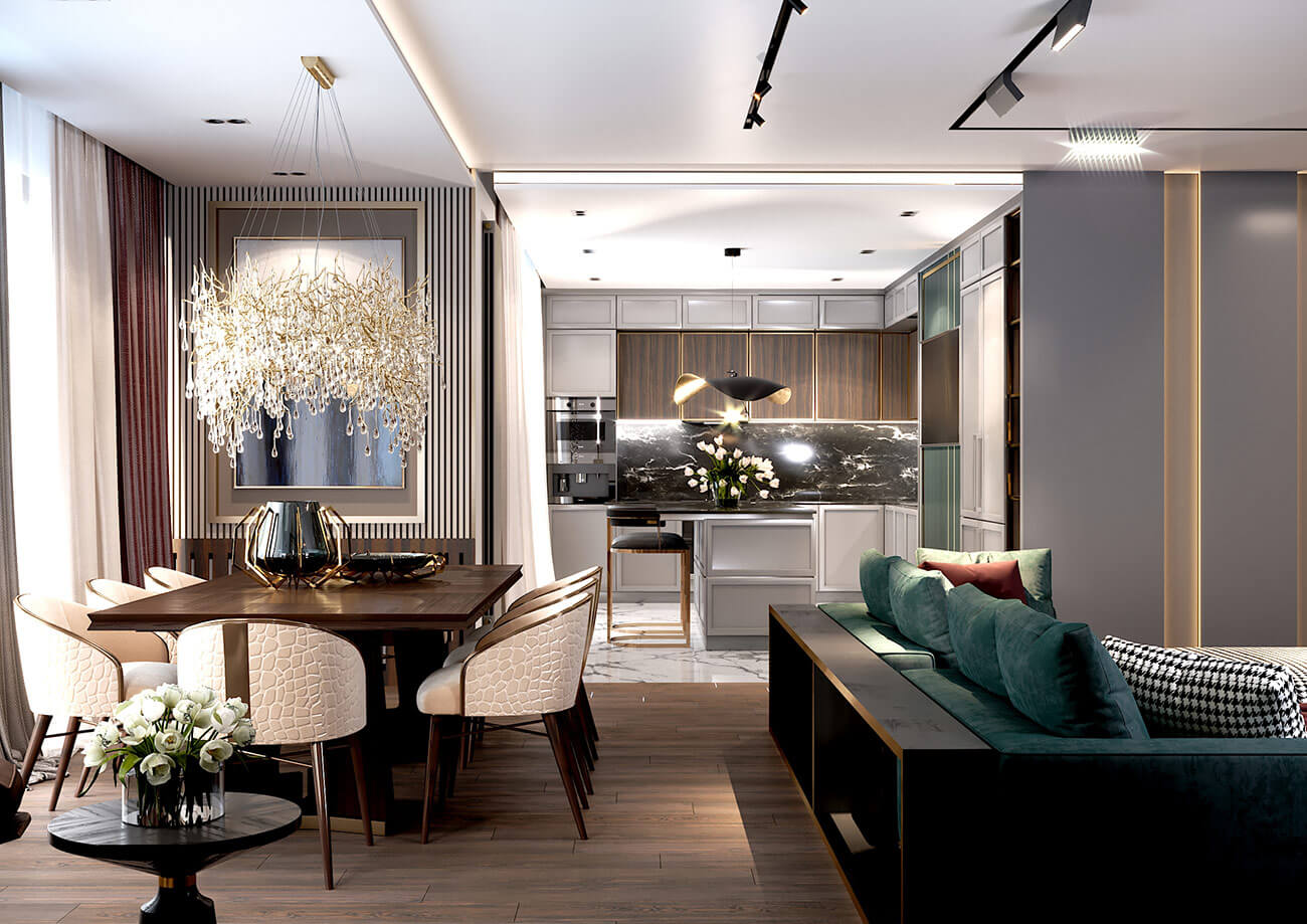 В основе всего интерьера — конструктивные, максимально функциональные решения, немного загадки и много красоты. Преобладают теплые пастельные тона и глубокий зеленый.