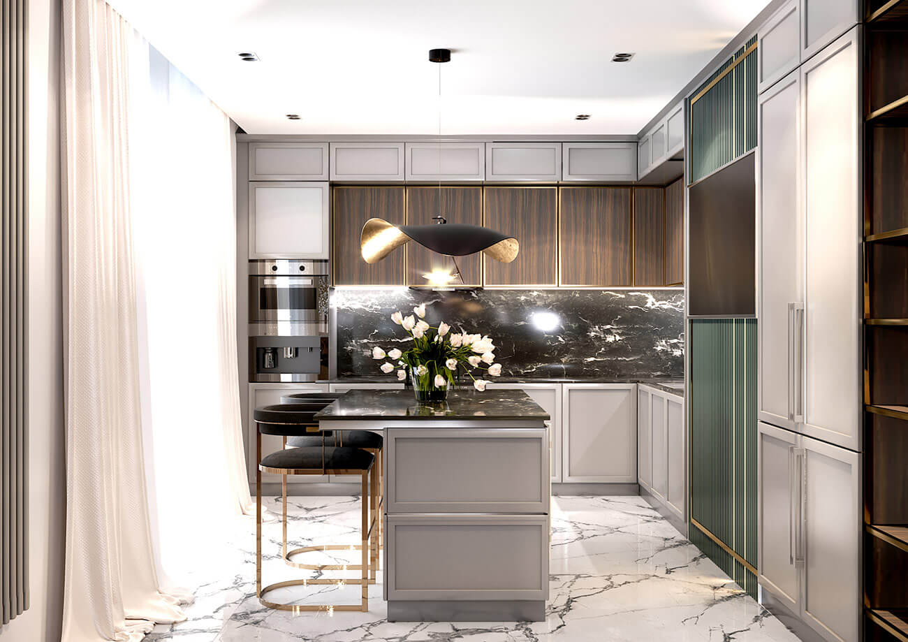 Кстати, центральным элементом кухни стал остров, в котором мы удачно спрятали винный шкаф.