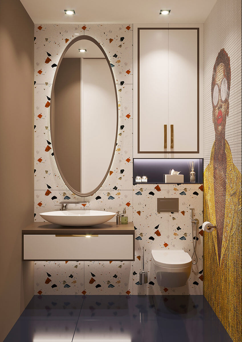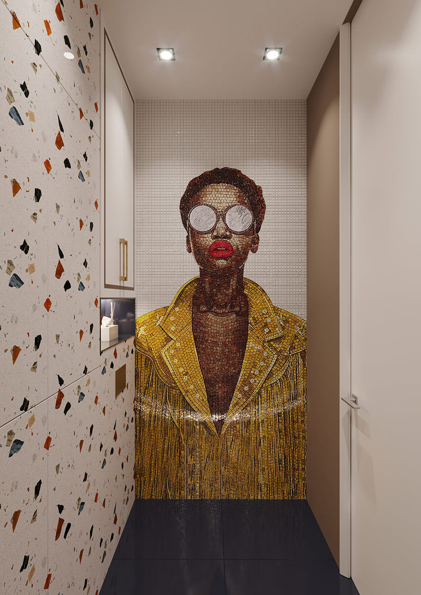 Волшебства добавили и в хозяйскую мастер-спальню - стену в санузле украсило панно из мозаики, собранное вручную.