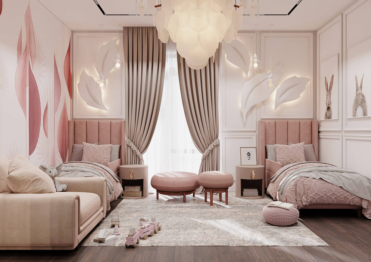 Главные герои в нашей истории — две маленькие милые девочки. Именно для них мы создали волшебную игровую комнату, где есть Вигвам, дом с лестницей и стильная зона ТВ. Отдельно оборудовали спальню с гардеробной и собственный санузел.