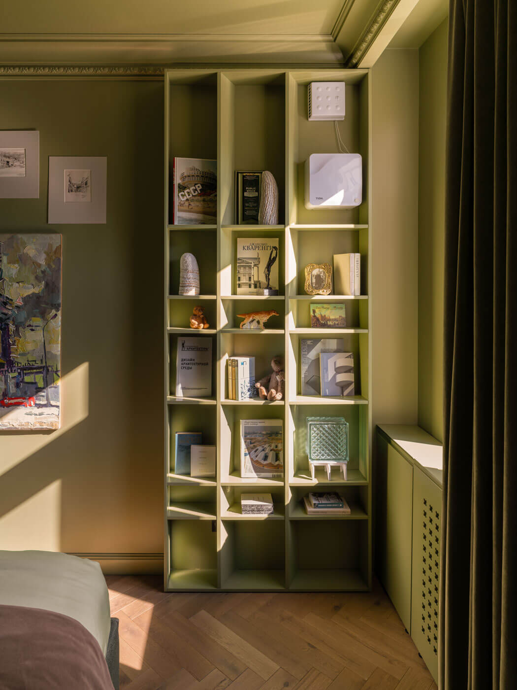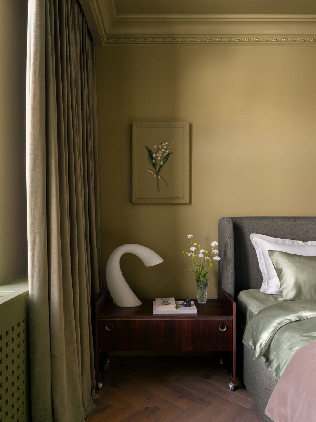 В спальне живут два главных героя, те самые “предметы памяти”, — кресло с оливковой обивкой и консоль с круглыми ручками. Вещи с историей, наполненные теплом, становятся смысловым центром интерьера.