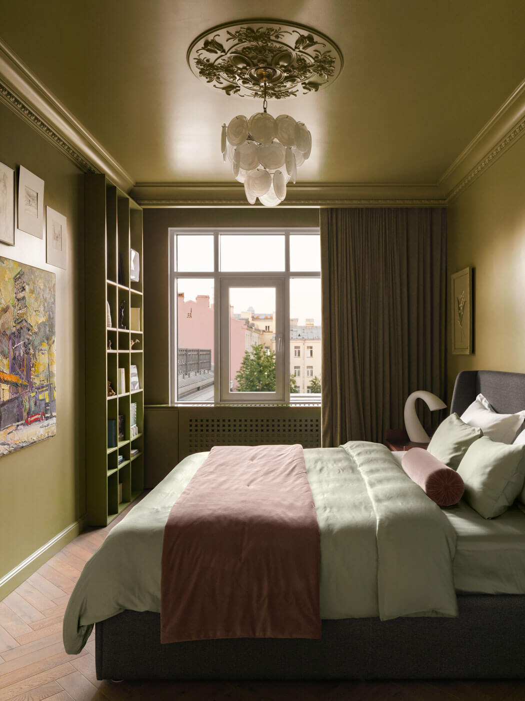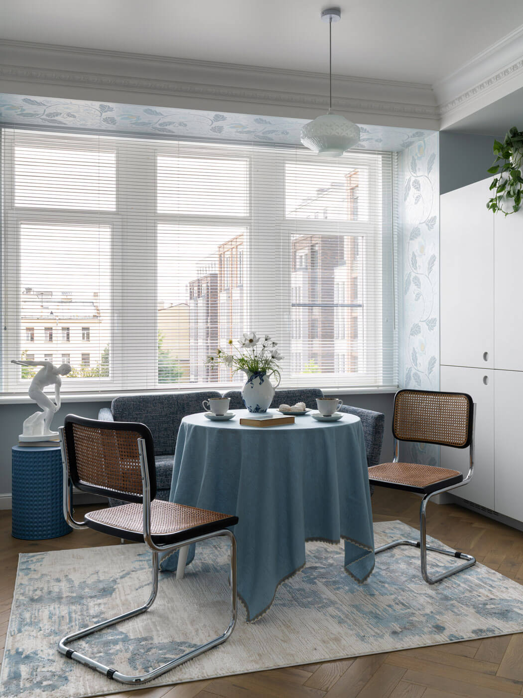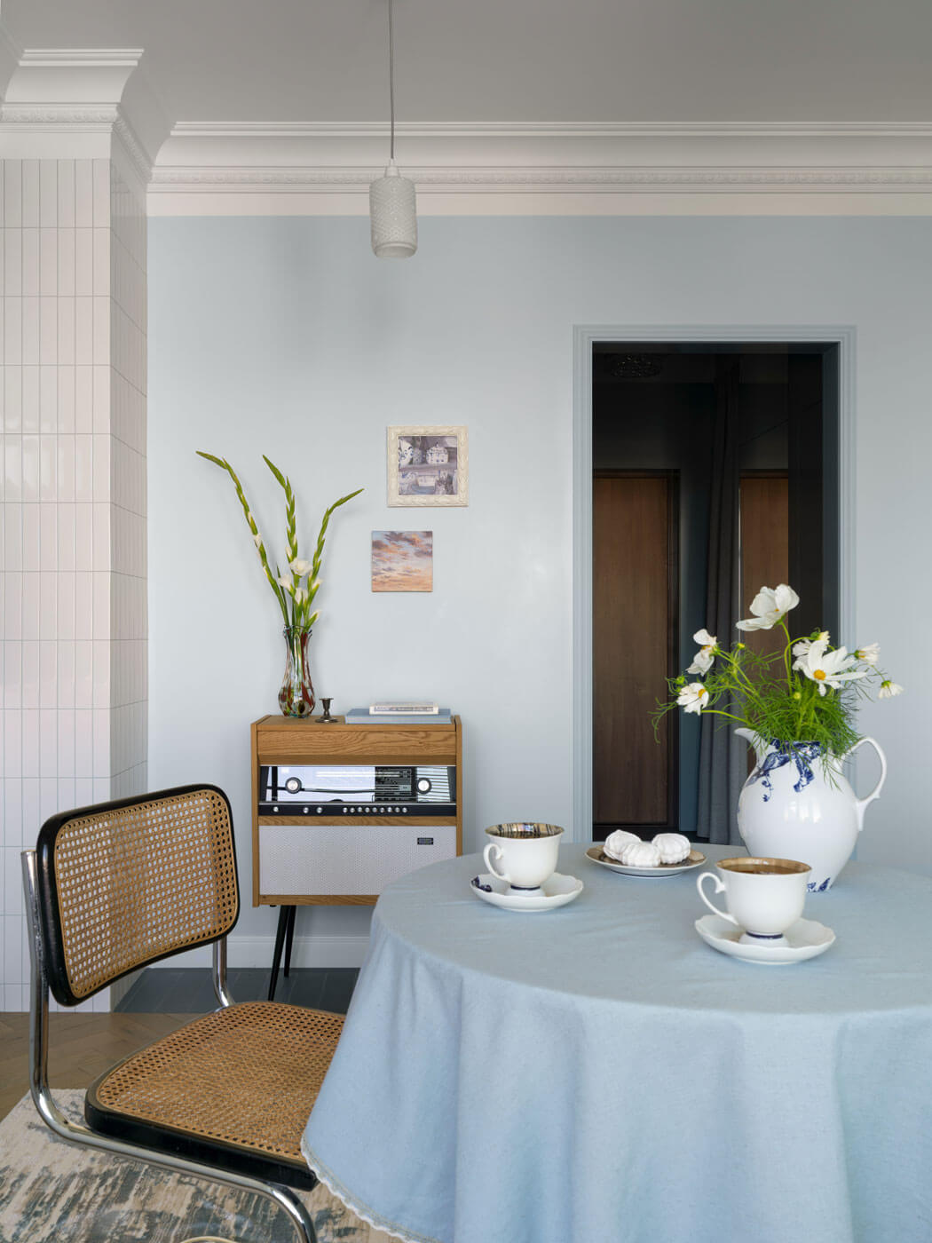 40 квадратных метров — немного, но здесь пространство воспринимается объемным и многослойным. Цвет задает тон: глубокий зеленый спальни, вдохновленный Эрмитажем и картинами Васнецова из Русского музея, мягкий голубой кухни и гостиной, словно фарфоровый узор императорского фарфора, пыльно-розовый ванной, отсылающий к историческому фасаду дома за окном. Вместе они создают плавные переходы и незримый диалог с городом.