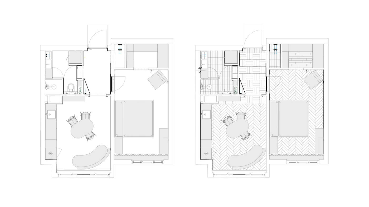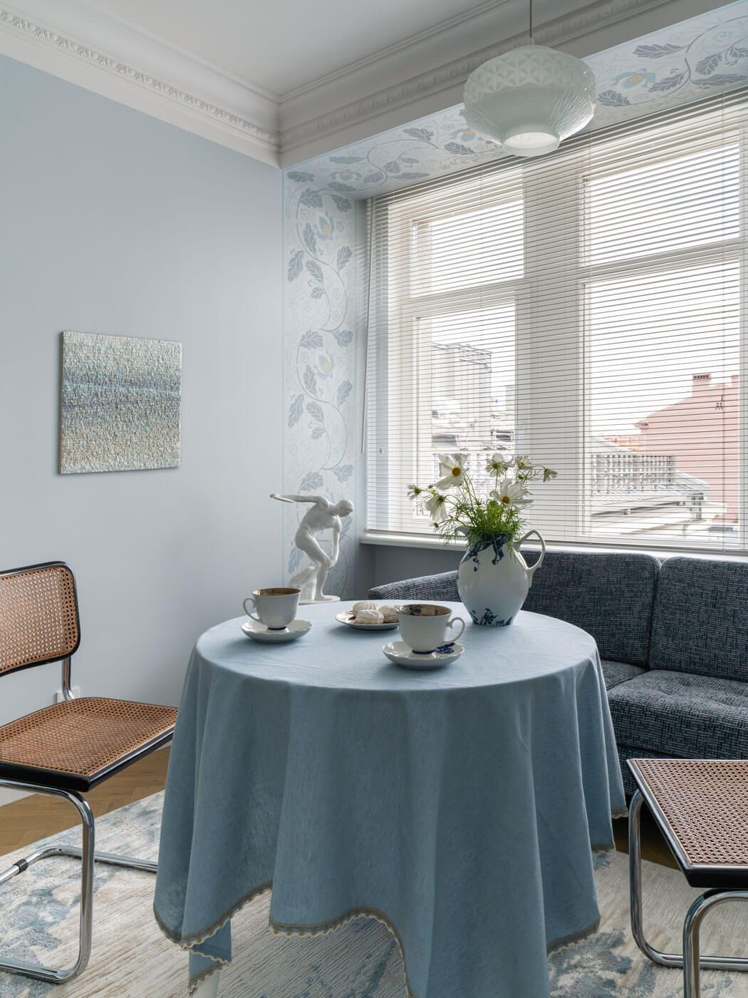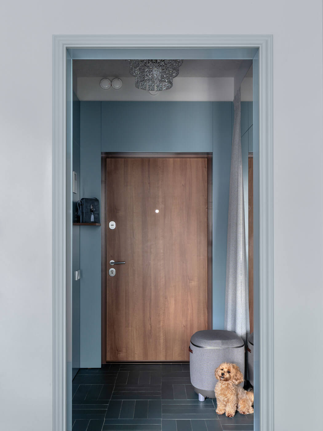 40 квадратных метров — немного, но здесь пространство воспринимается объемным и многослойным. Цвет задает тон: глубокий зеленый спальни, вдохновленный Эрмитажем и картинами Васнецова из Русского музея, мягкий голубой кухни и гостиной, словно фарфоровый узор императорского фарфора, пыльно-розовый ванной, отсылающий к историческому фасаду дома за окном. Вместе они создают плавные переходы и незримый диалог с городом.