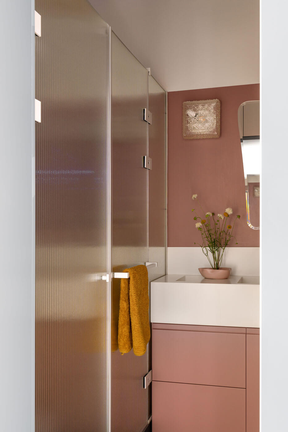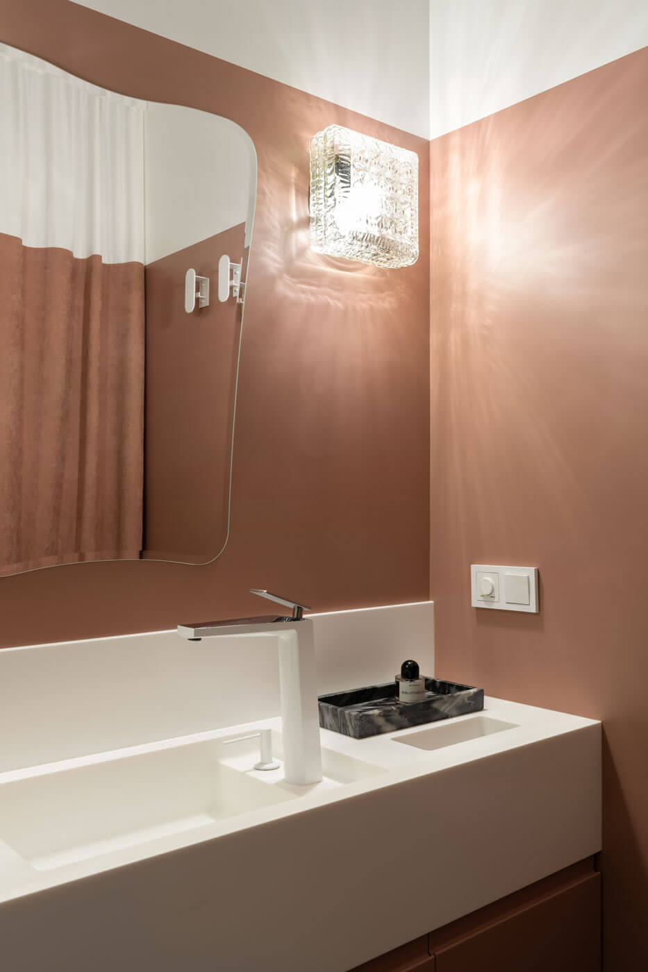 Даже ванная хранит отсылки к прошлому: стены окрашены не до потолка — прием, знакомый по советским квартирам, где краску экономили. Здесь же это превращается в художественный подход, еще один «мостик» между эпохами.