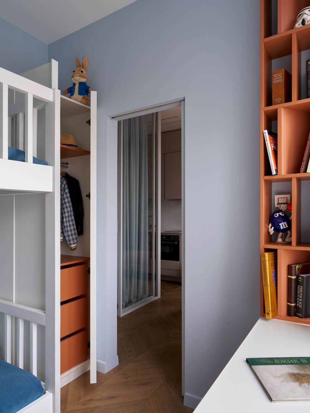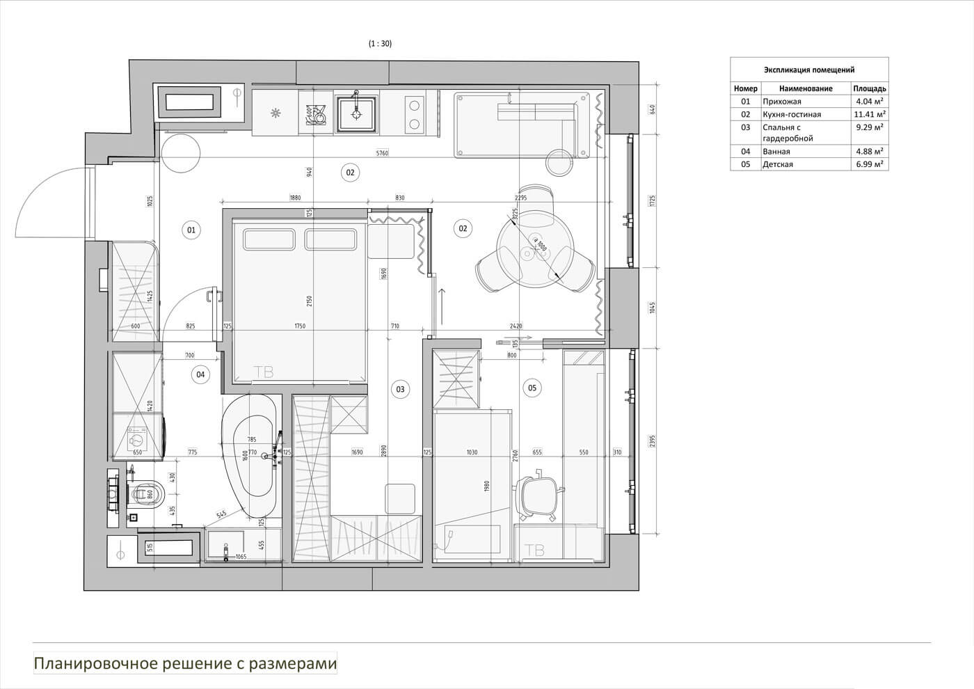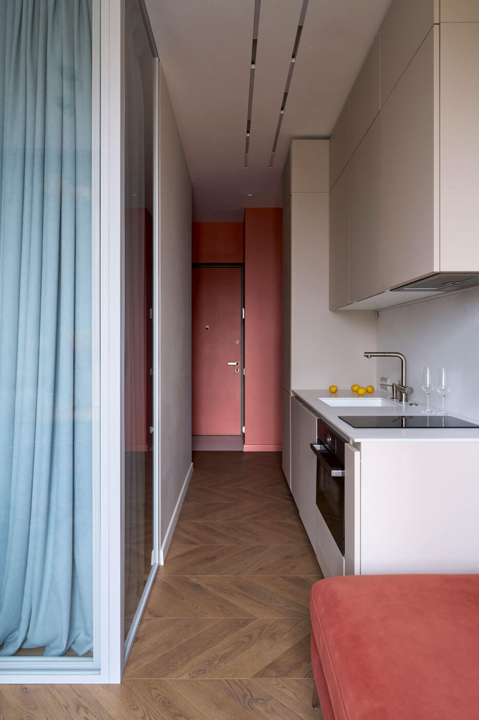 На площади, предназначенной для однокомнатной квартиры, предполагалось создать зону гостиной с примыкающей к ней кухней, выделить приватный блок для мамы и отдельную комнату подрастающего поколения, организовать гардеробную, санузел и прихожую. Не менее важной задачей стало сохранение максимального количества дневного света во всех комнатах.