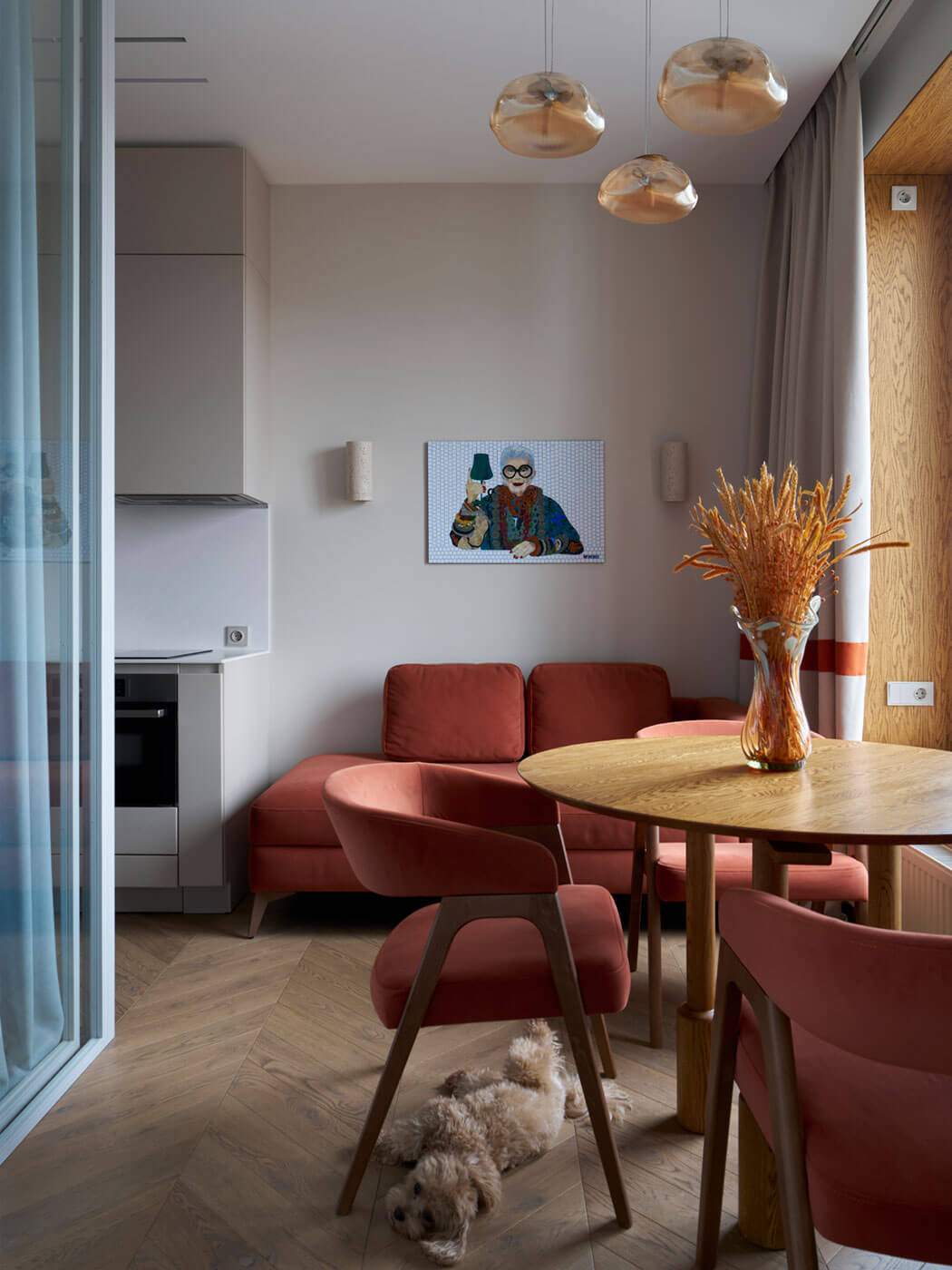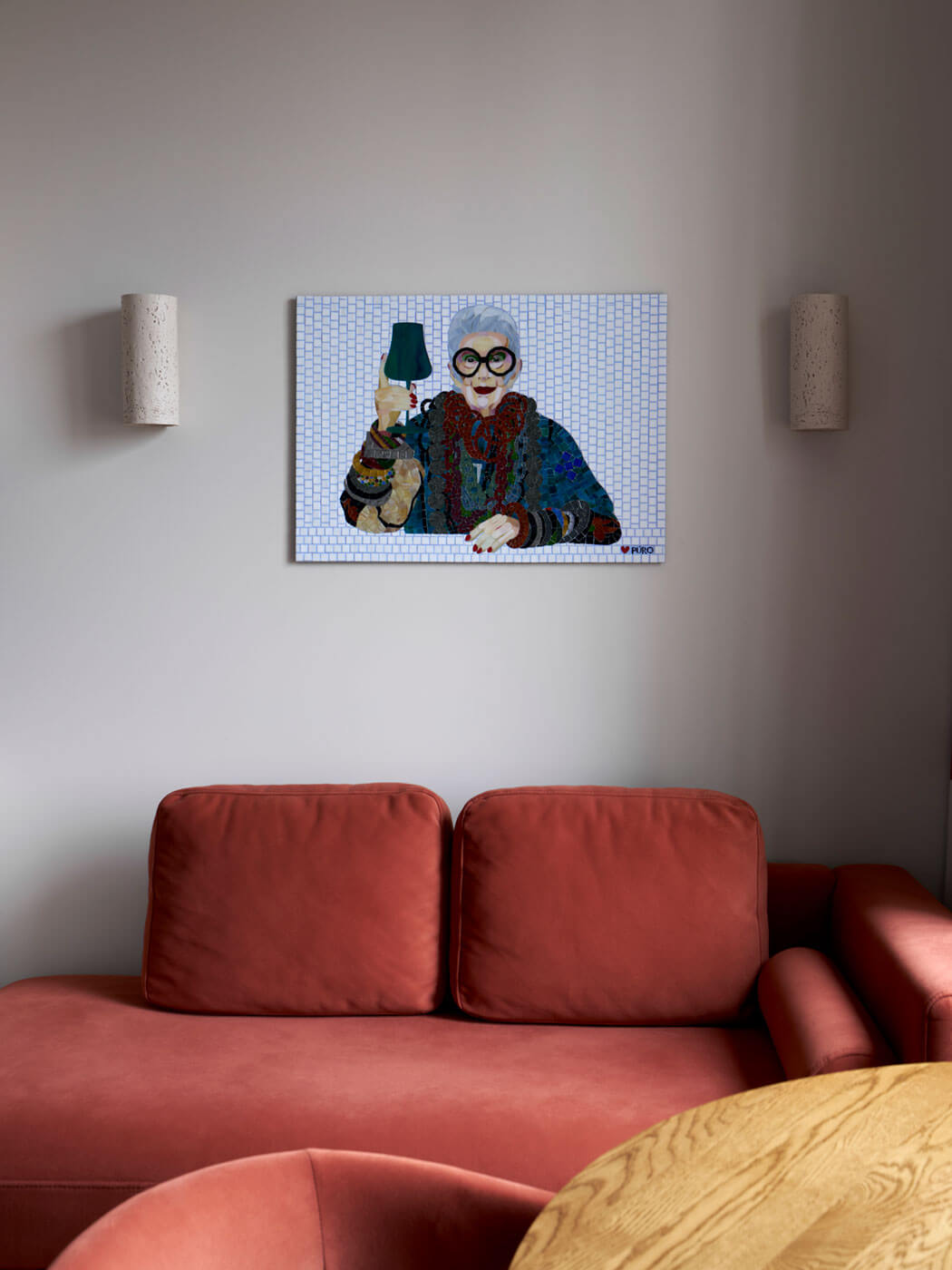По интерьеру сразу виден характер. Панно из мозаики в кухне-гостиной с известной иконой стиля и дизайнером интерьеров Айрис Апфель служит акцентом всего пространства и отражает творческую составляющую личности.