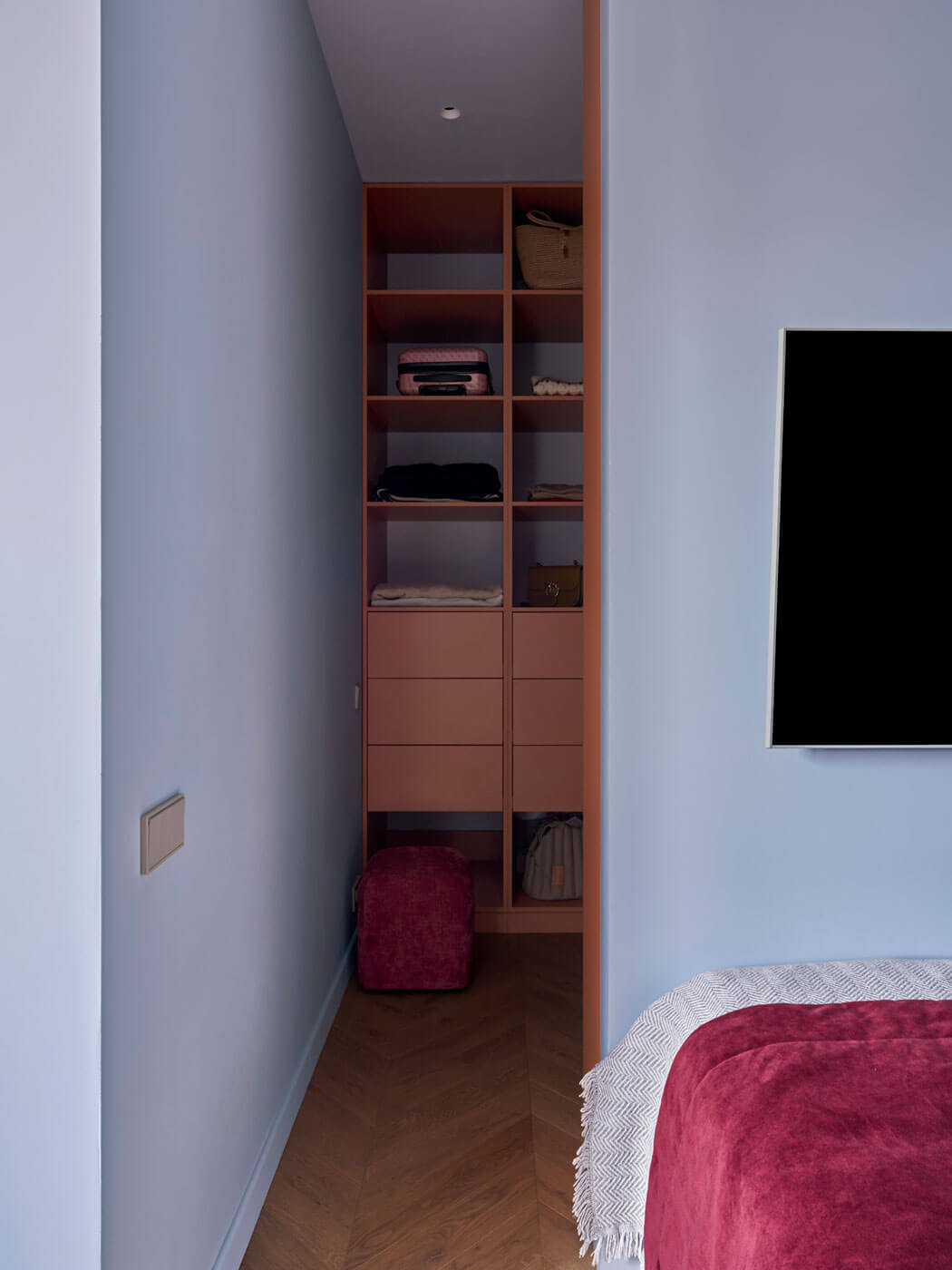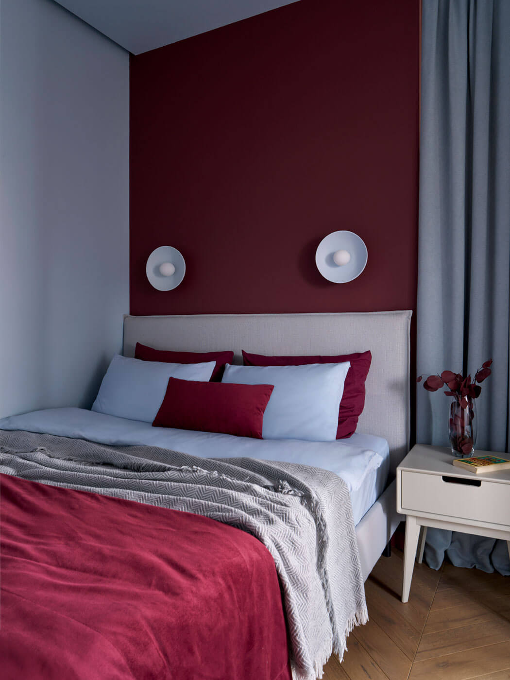 Небольшая спальня и детская комната необходимы только для сна и отдыха, но в них есть все необходимое из предметов мебели и отдельная гардеробная зона, а главное много света. Естественный свет в спальне удалось сохранить за счет стеклянной перегородки вместо стен, а много текстиля в спальне создает особый уют и обволакивающее пространство.
