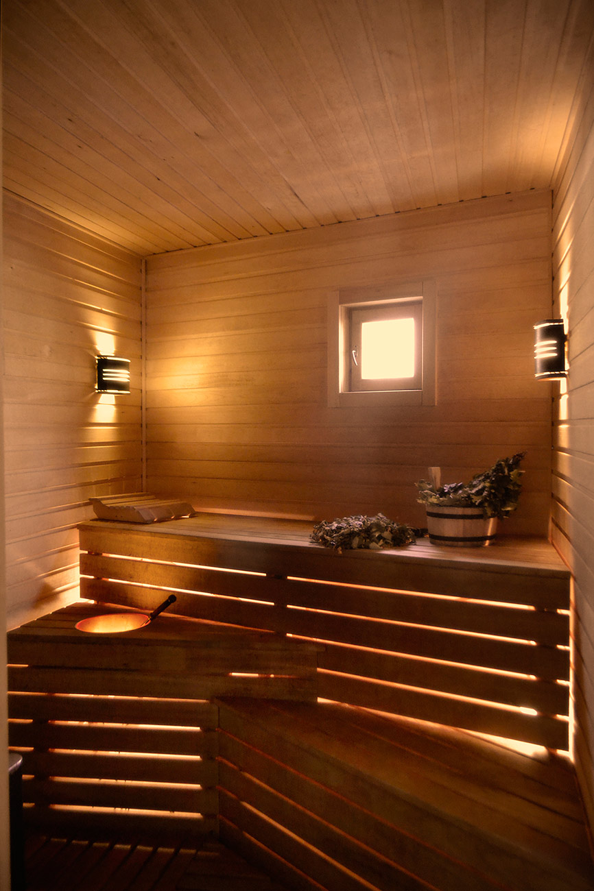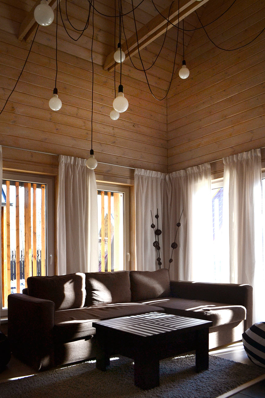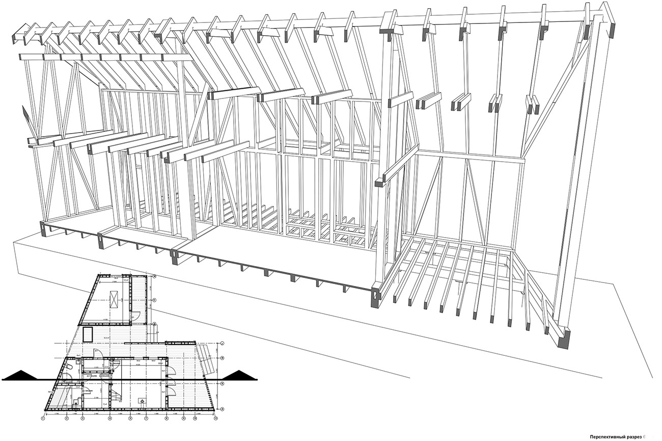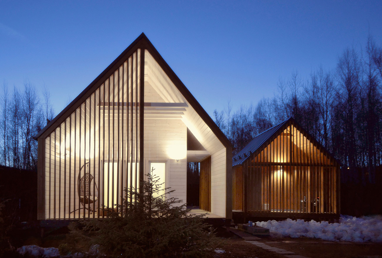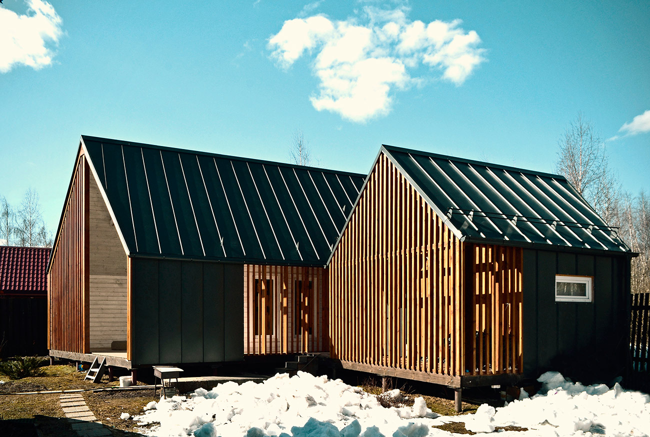 При проектировании объекта стояла задача построить компактный, но простой в обслуживании зимний дом с баней, для зимнего проживания, как альтернатива большому кирпичному дому, расположенному на участке. Пространственная композиция представляет собой два геометрически подобных здания, объединенных общей террасой, покрытой декингом. Терраса частично перекрыта кровлей большого дома, а также в один уровень с полом в нее встроена небольшая купель. Когда купель не используется, она закрыта крышкой и сливается с покрытием террасы.
