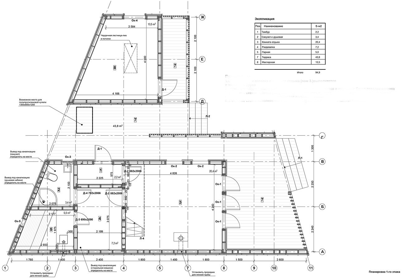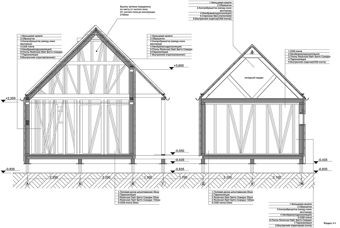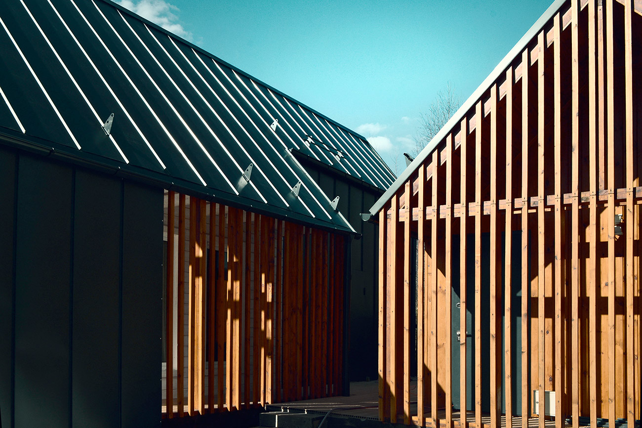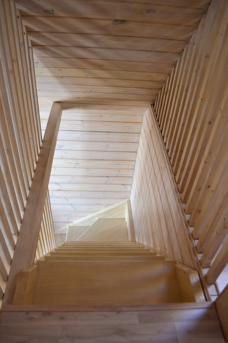 Здания каркасные, в качестве фундамента использовались винтовые сваи. Отделочные материалы экстерьера и интерьера перекликаются, объединяясь в единую архитектурную концепцию. Трапецивидная форма участка, на котором расположен дом, повлияла на композицию объемов и внутреннюю планировку, так, в частности, в парной появились треугольные полоки.