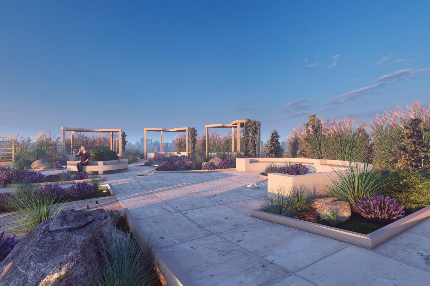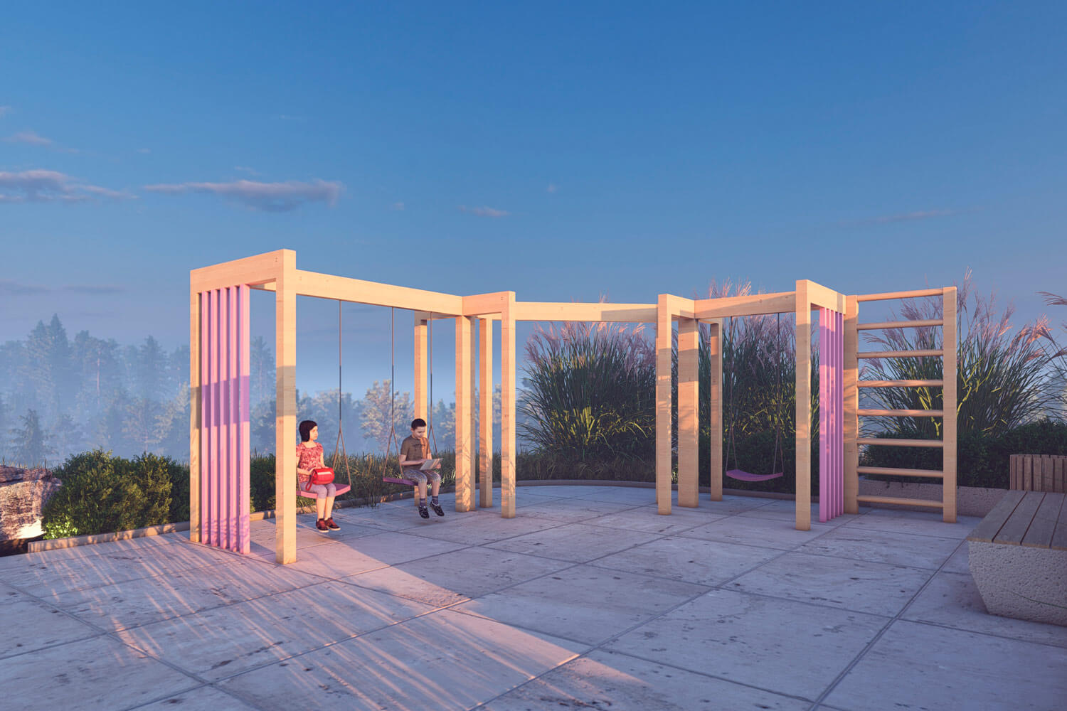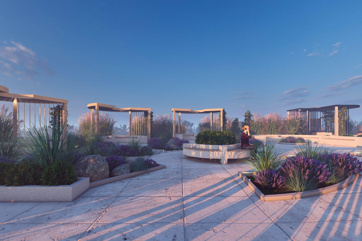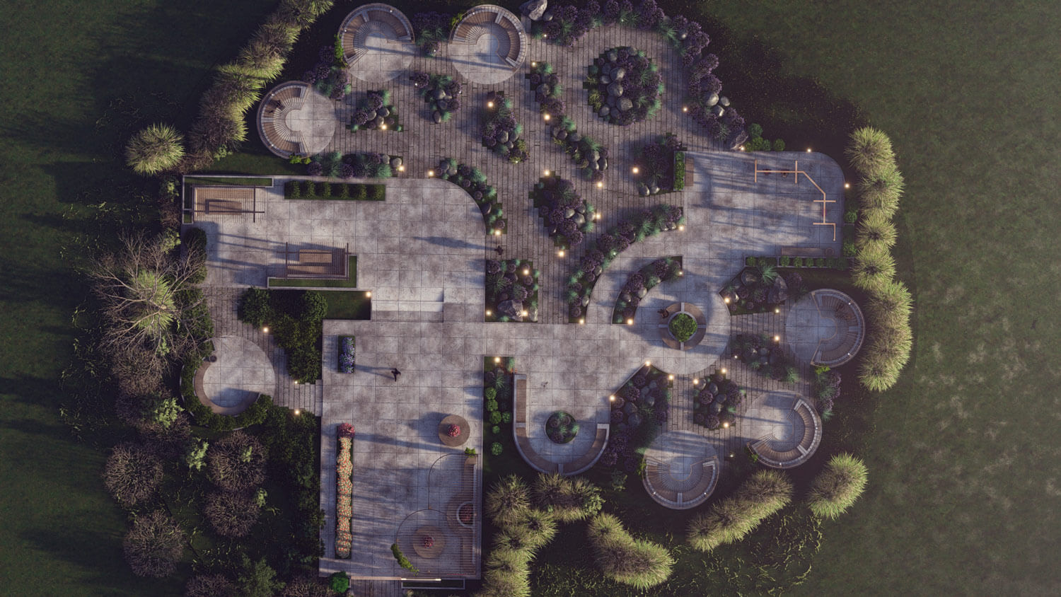 Сердцем зоны отдыха станет центральная площадь, обрамленная плавными линиями дорожек, плавно перетекающих друг в друга. Округлая форма площадей и изгибы тропинок символизируют природные ландшафты и создают ощущение естественности.